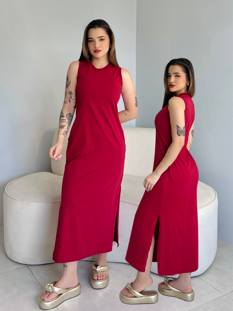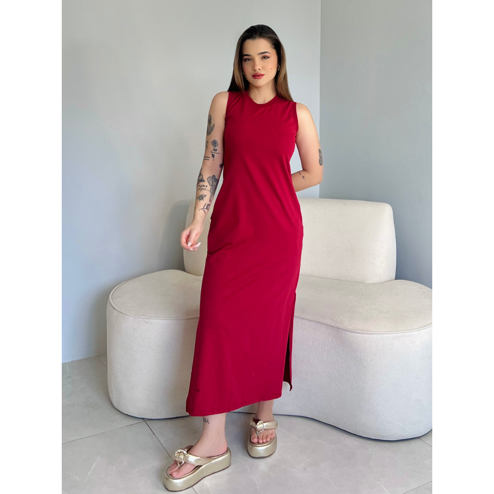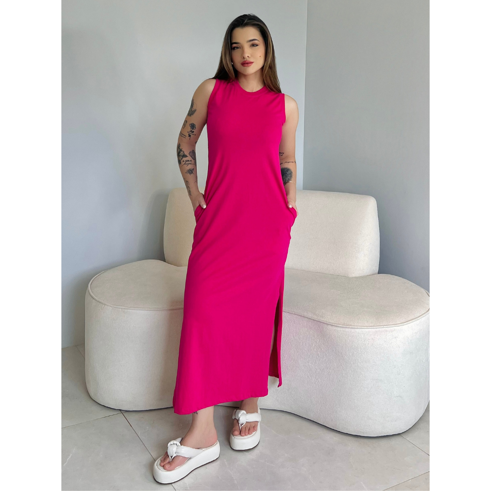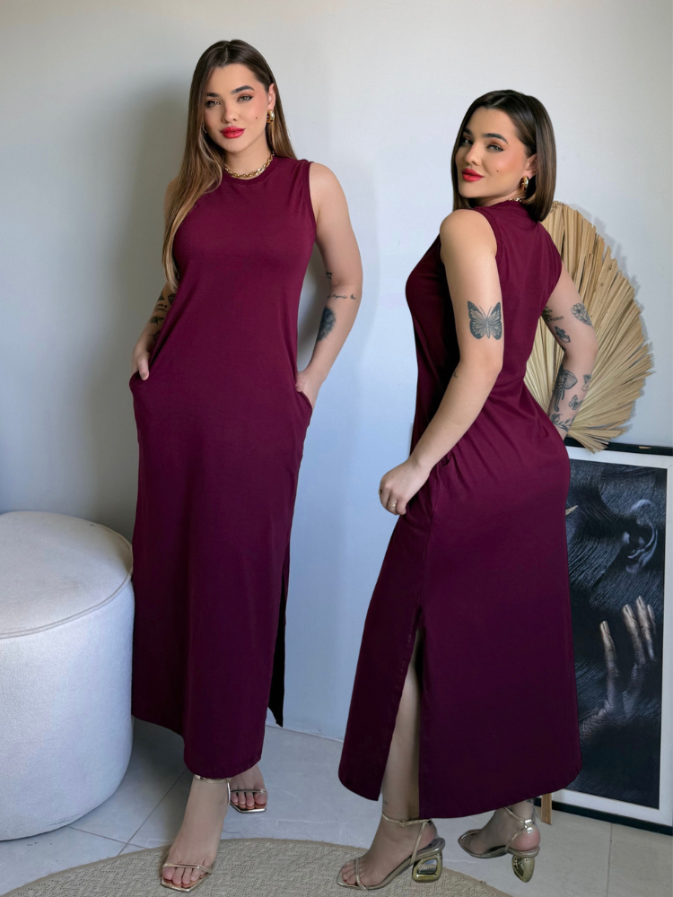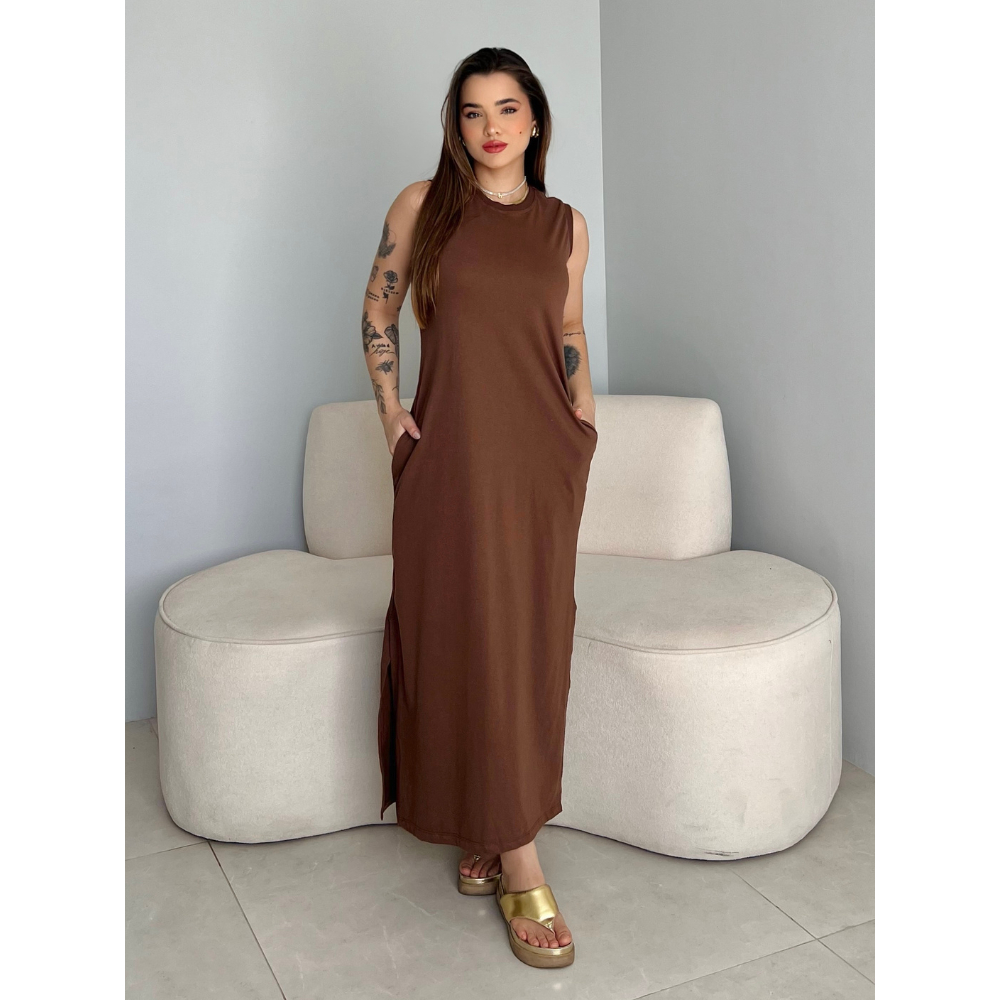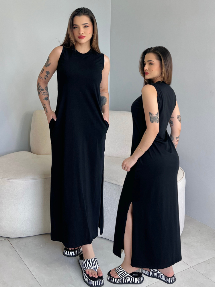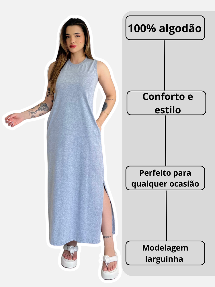 Vestidos Feminino Longo Com Bolso e Fenda nas Laterais Cavado Algodão Alta Qualidade Premium