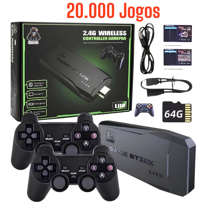 Video Game Stick 4K Com 20000 Jogos 64gb 2 Controles Sem Fio Console Portatil
