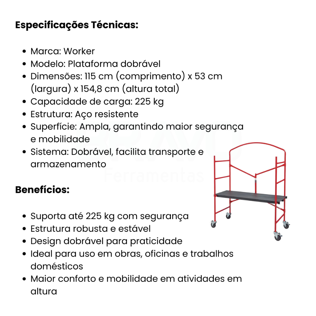 Worker Andaime Portátil De Aço 1.54x0.53m Com Rodas 225kg