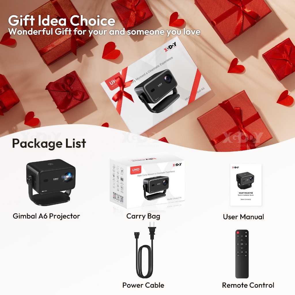 XGODY Gimbal A6 Projetor Inteligente 500ANSI Android 11 Foco Automático Nativo 1080P Wifi6 BT Alto-Falante Embutido