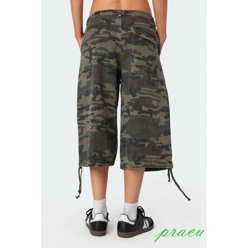 Y2K Cargo Shorts Femininos Verão Camuflagem Estampa Cordão Cintura Baixa Jeans Folgados