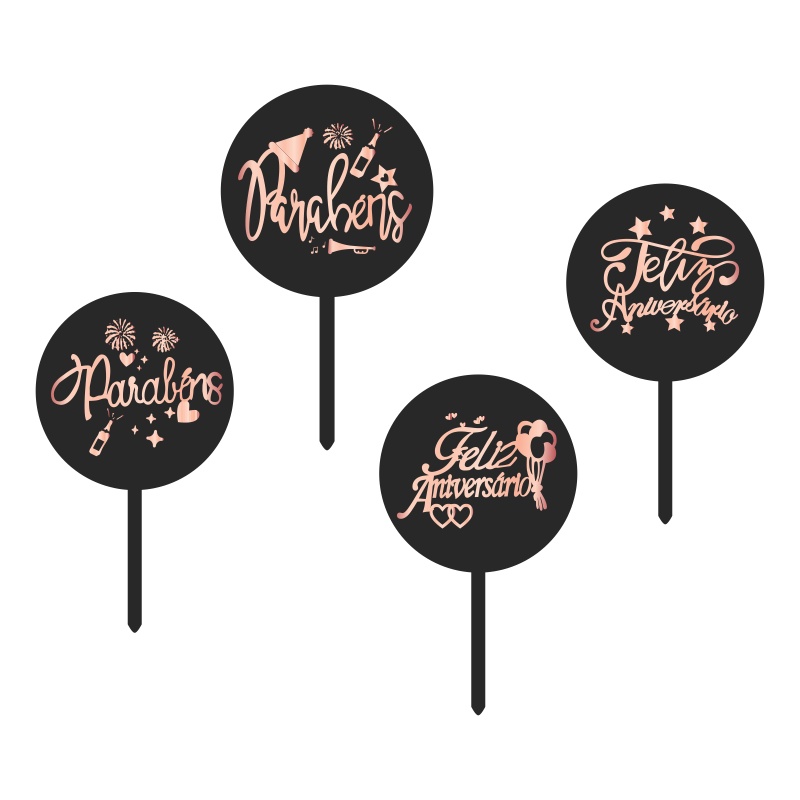 Topo de Bolo Redondo 15cm – “Feliz Aniversário” e “Parabéns” | Acrílico Elegante e Reutilizável