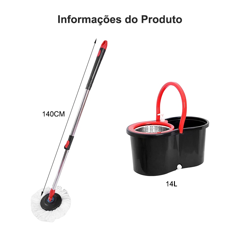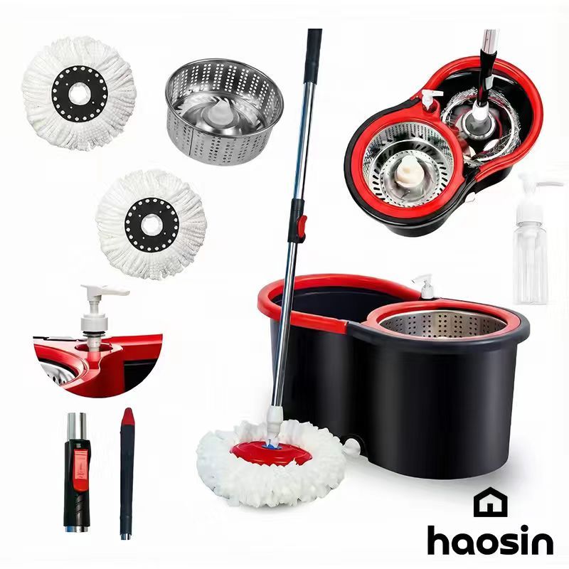 haosin mop Inoxidável Esfregão Giratório Profissional 14L c/ Balde, Rodas e Cabo 1,4m/2 Refis