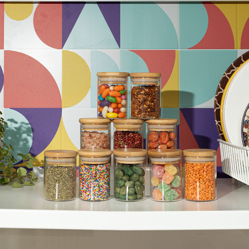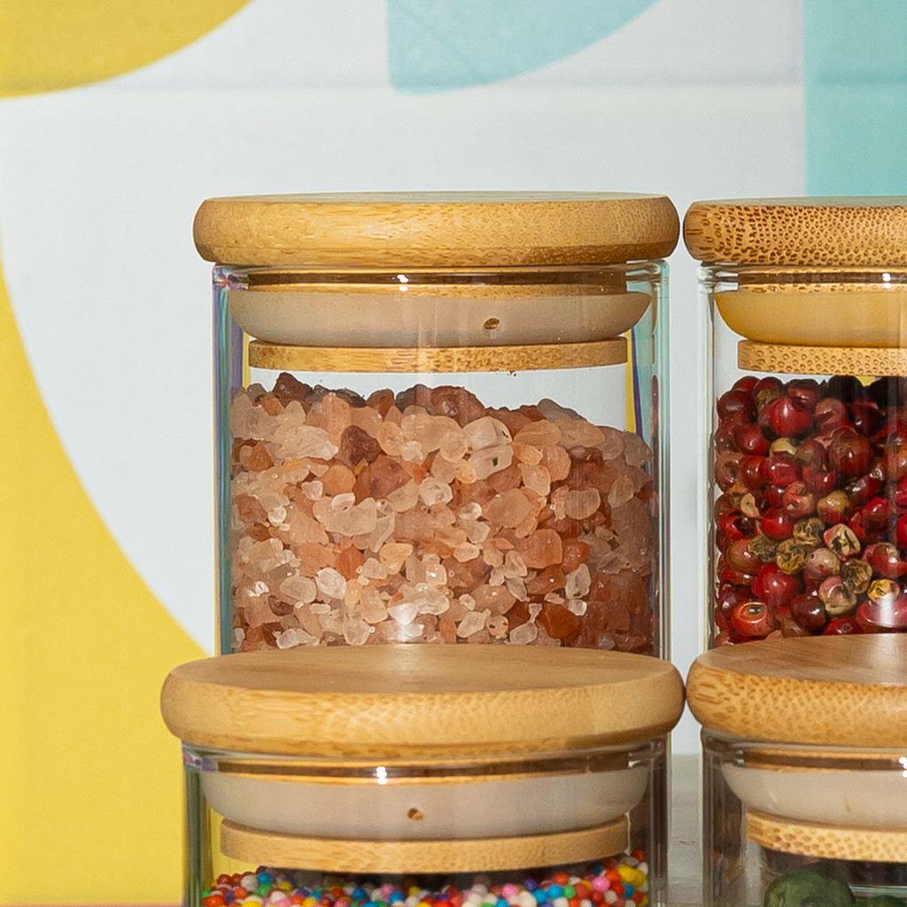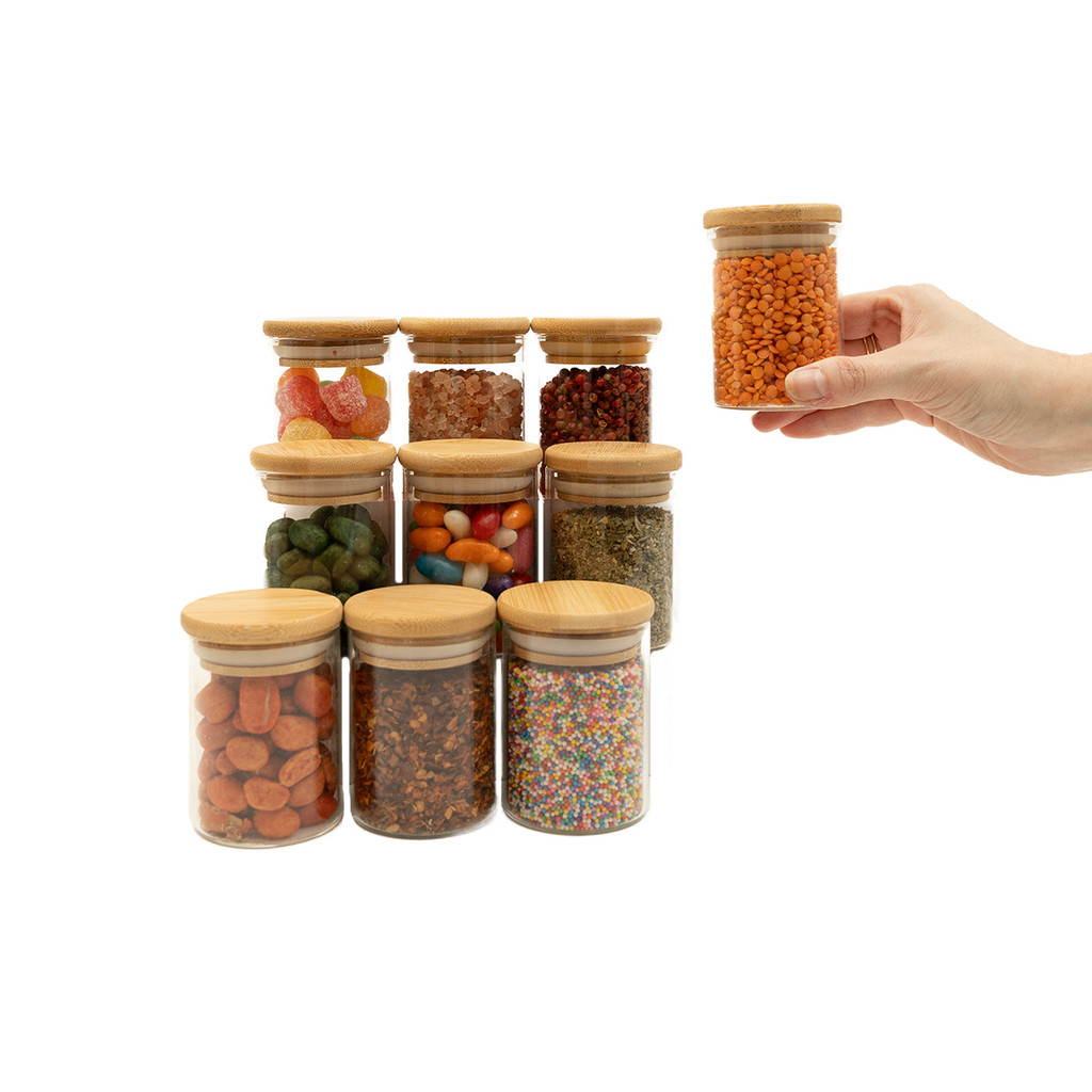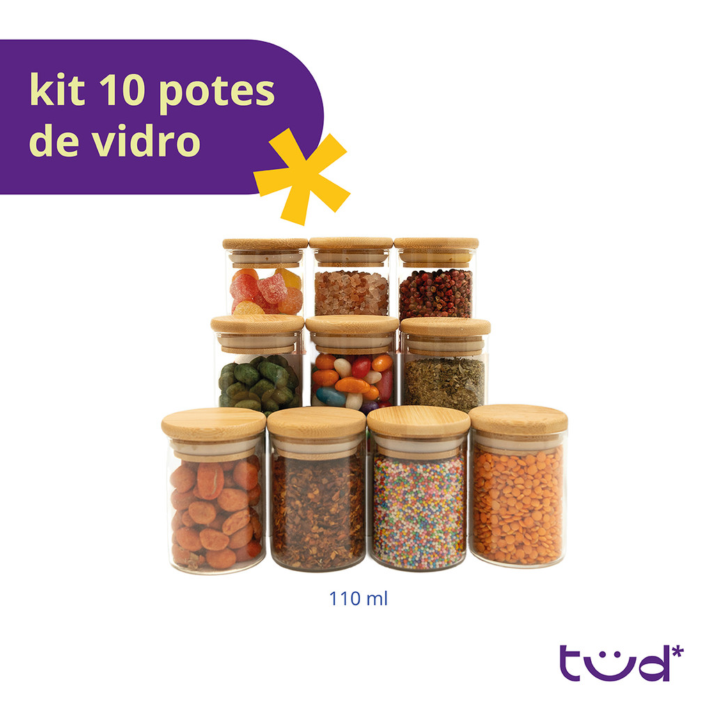 kit 10 potes de vidro 110ml com tampa de bambu hermético redondos - Tud