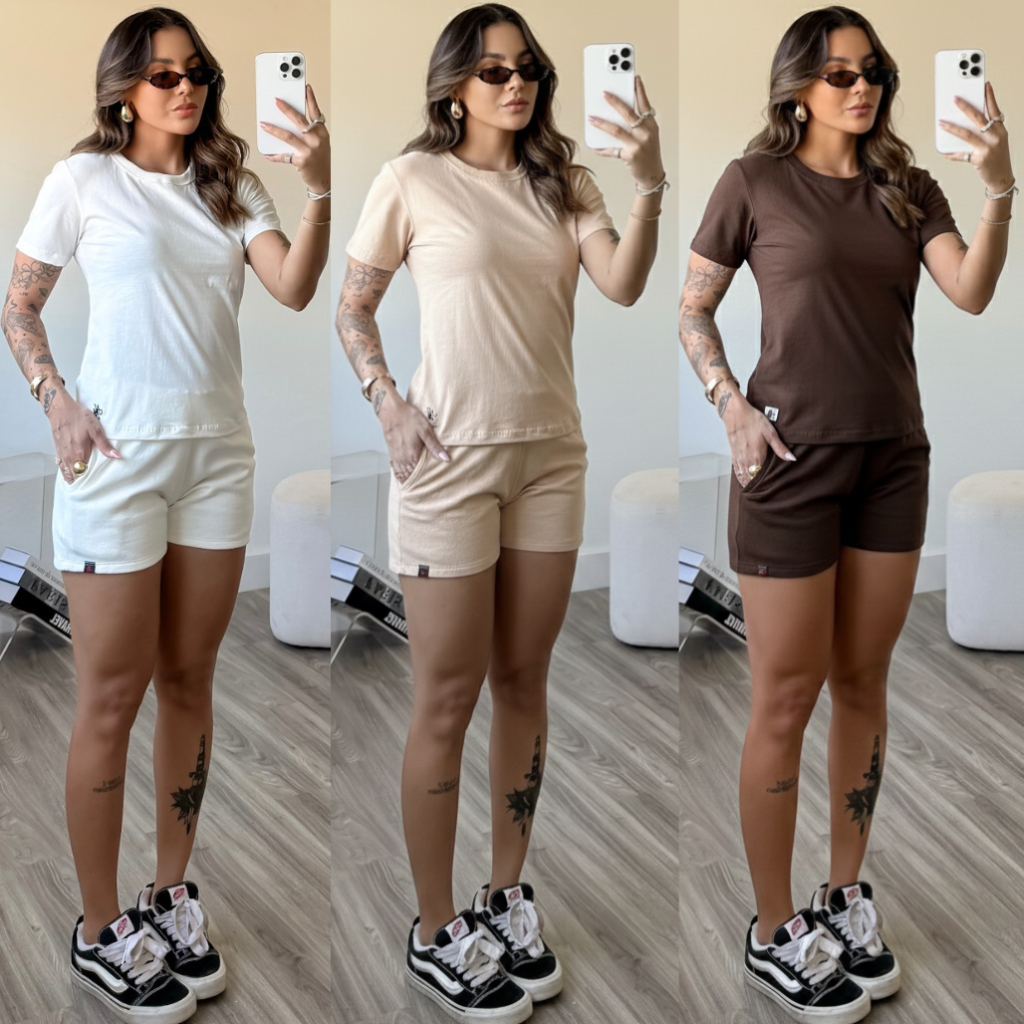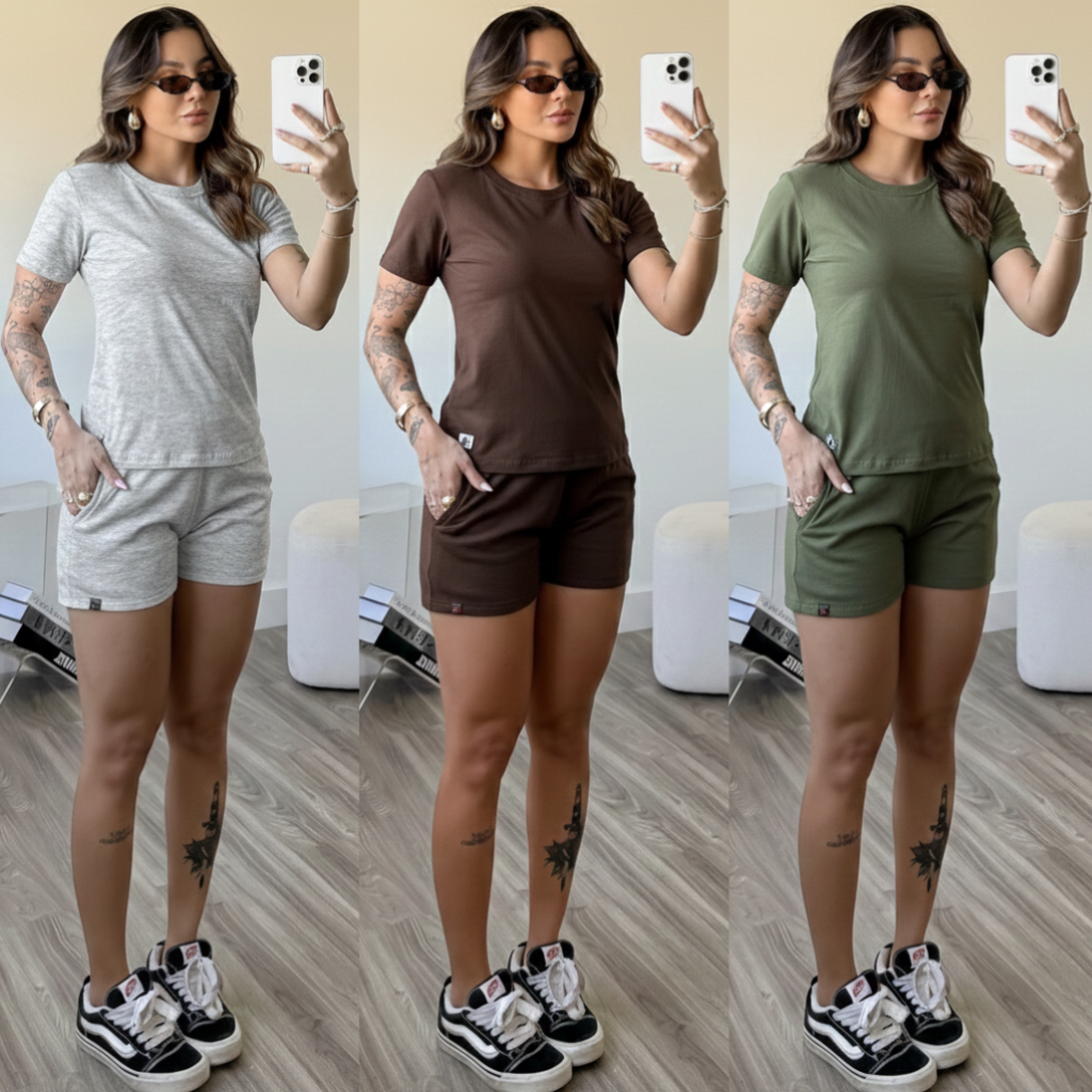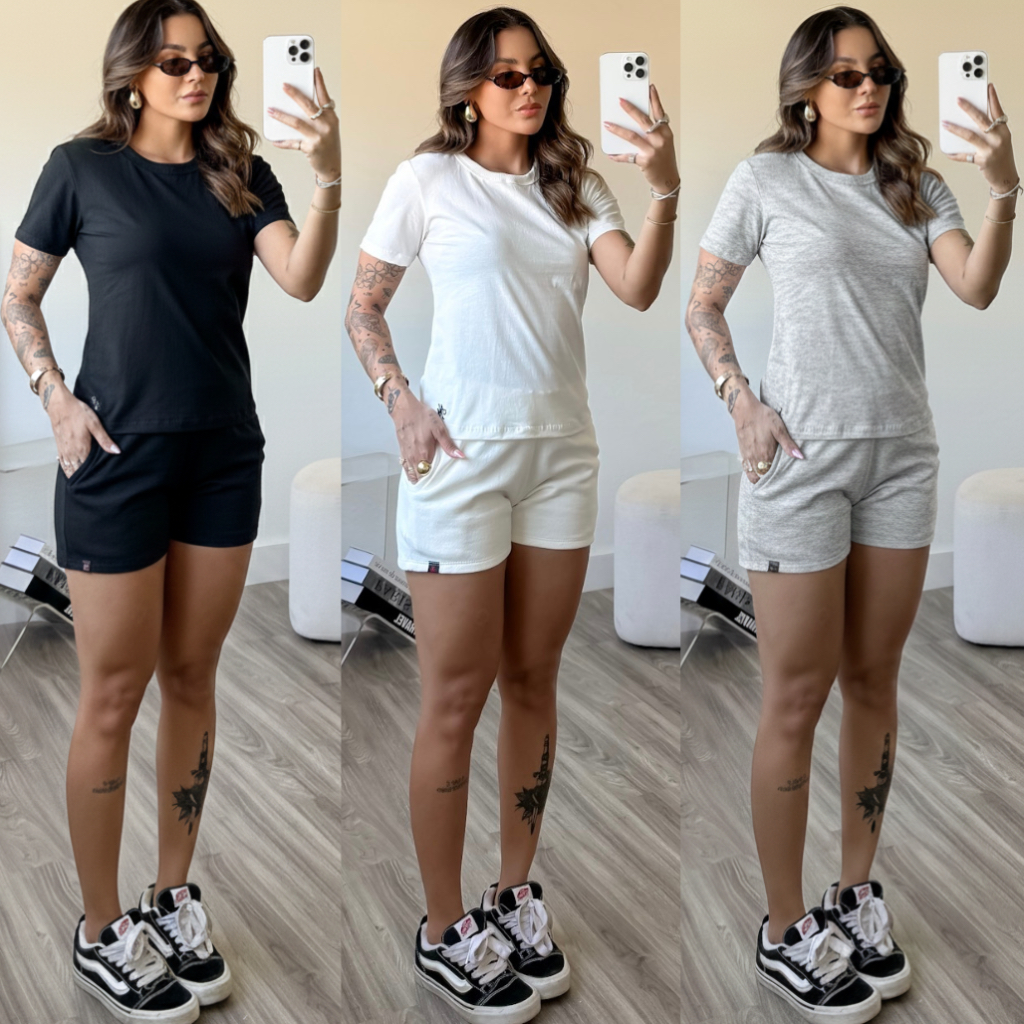 kit 3 conjunto feminino short feminino de moletom camiseta básica feminina blusa mais short de bolso blusa gola o