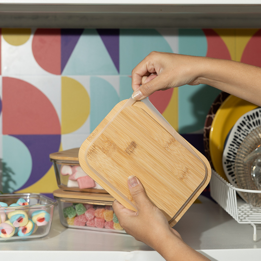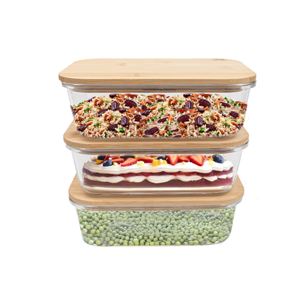 kit 3 potes de vidro 1L com tampa de bambu hermético marmita retangulares - Tud
