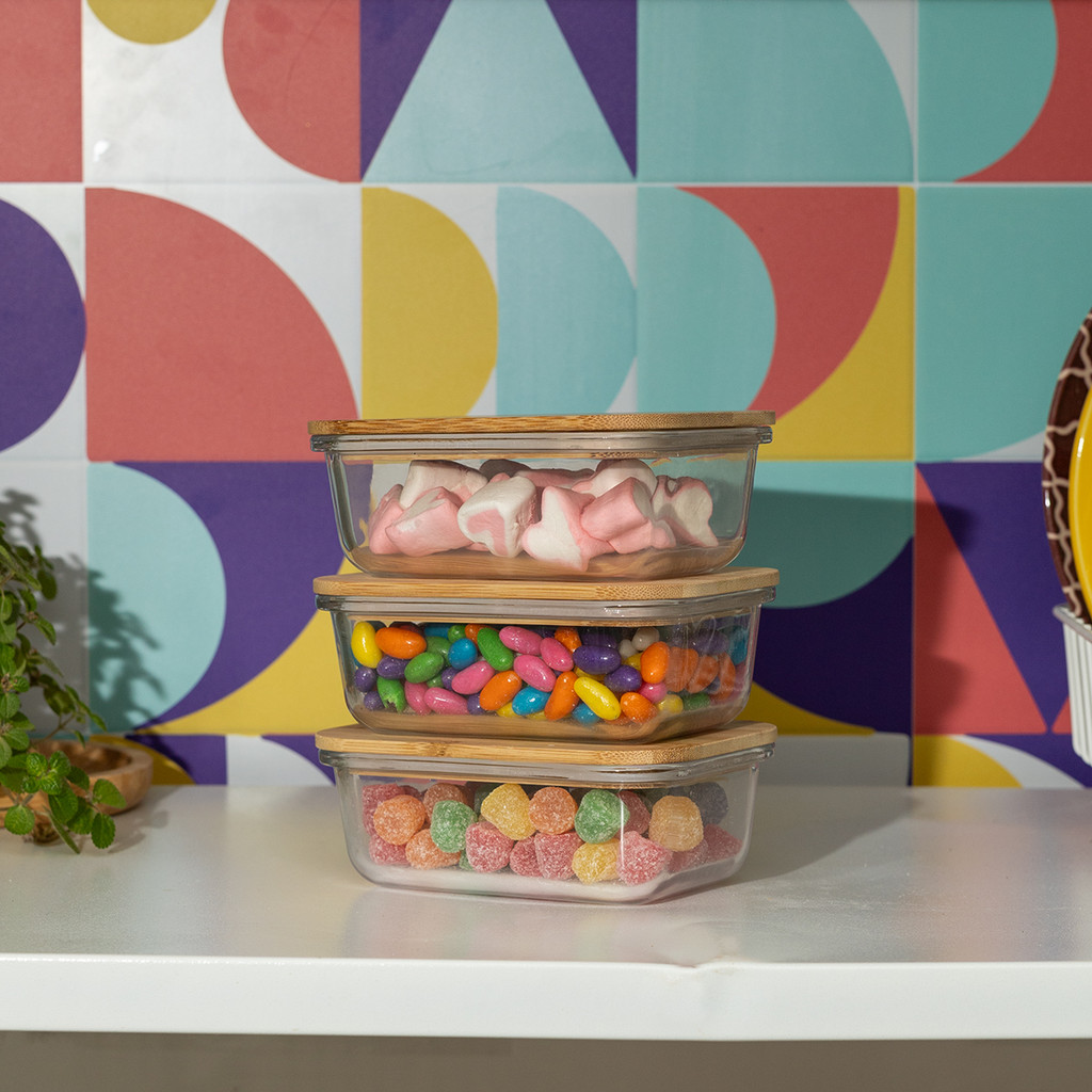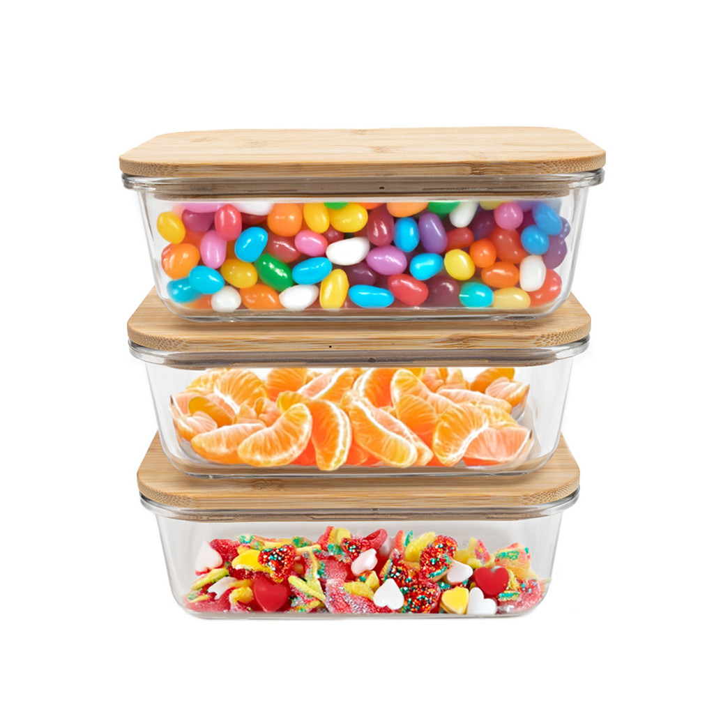kit 3 potes de vidro 800ml tampa de bambu hermético marmita retangulares - Tud
