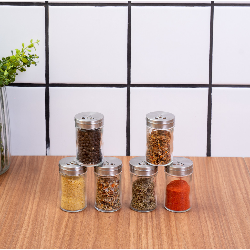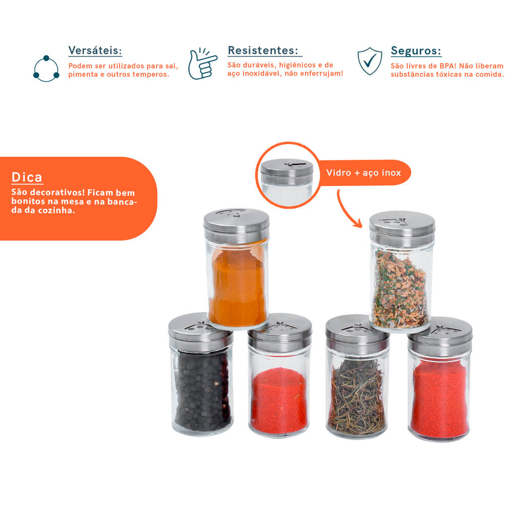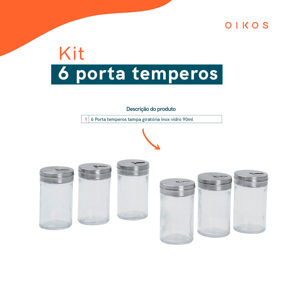 kit 6 Porta temperos com tampa giratória inox e vidro 90ml - Mozcada