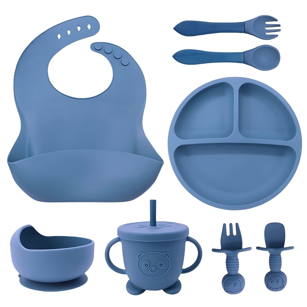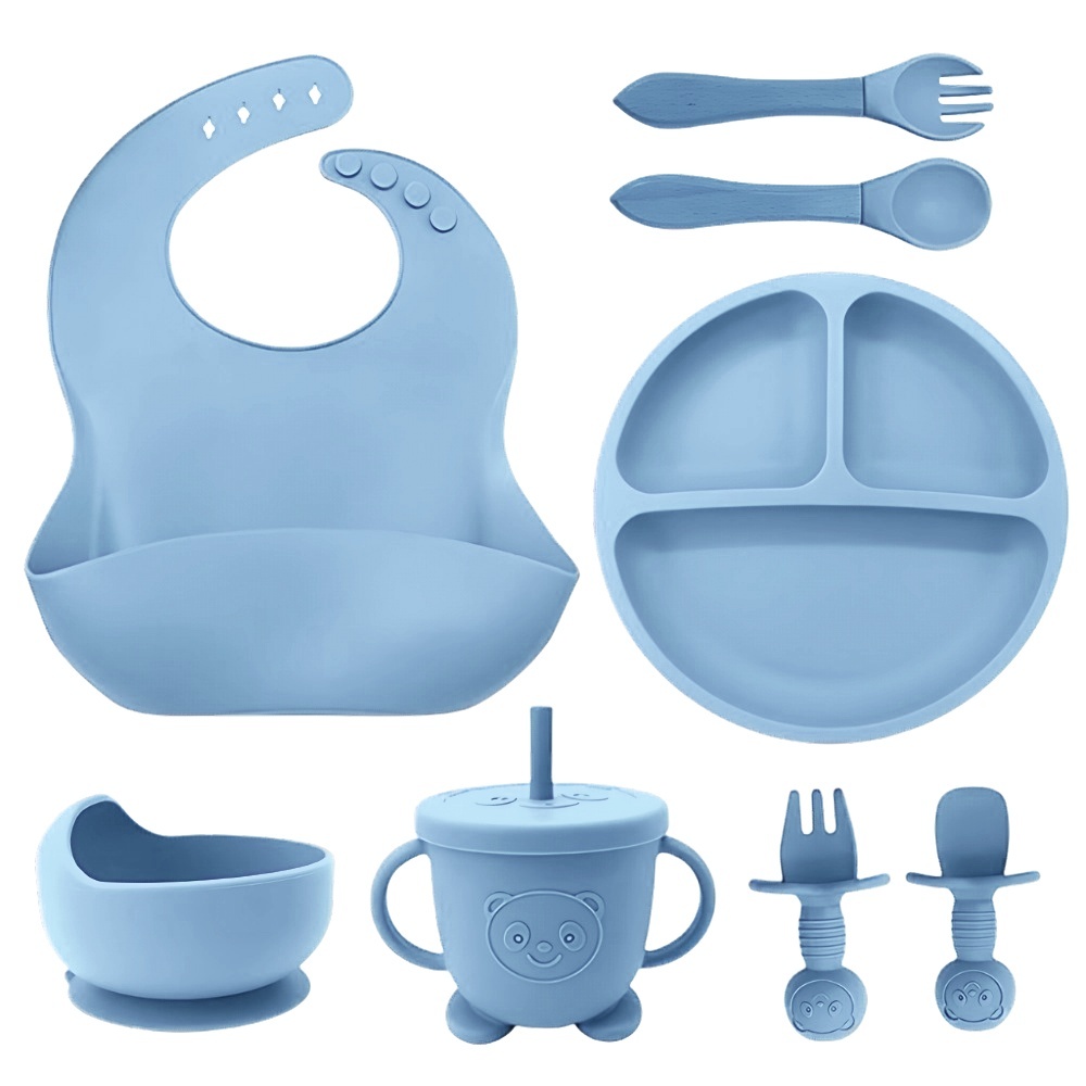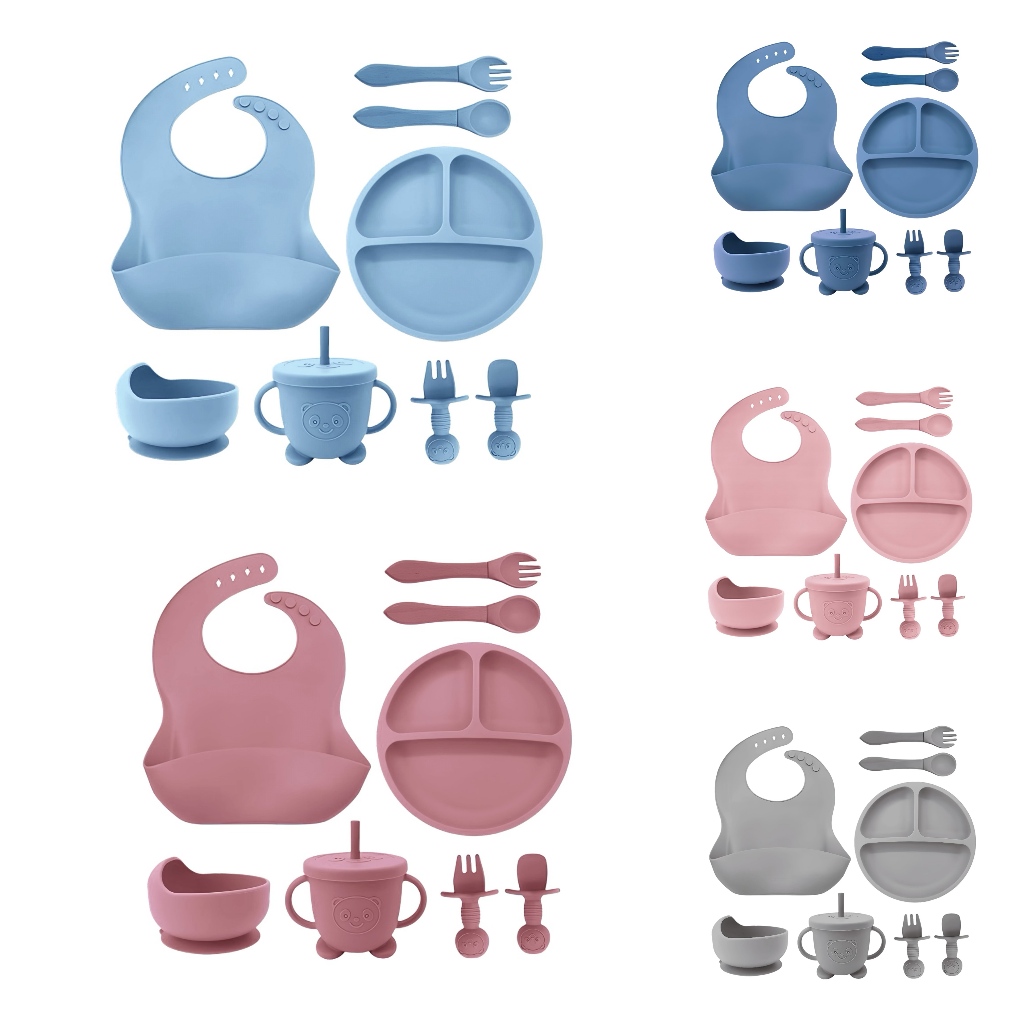 kit 8/6 Peças Talheres alimentação bebê silicone kit Talheres Infantil Com Ventosa Canudo Colher Babador Garfo