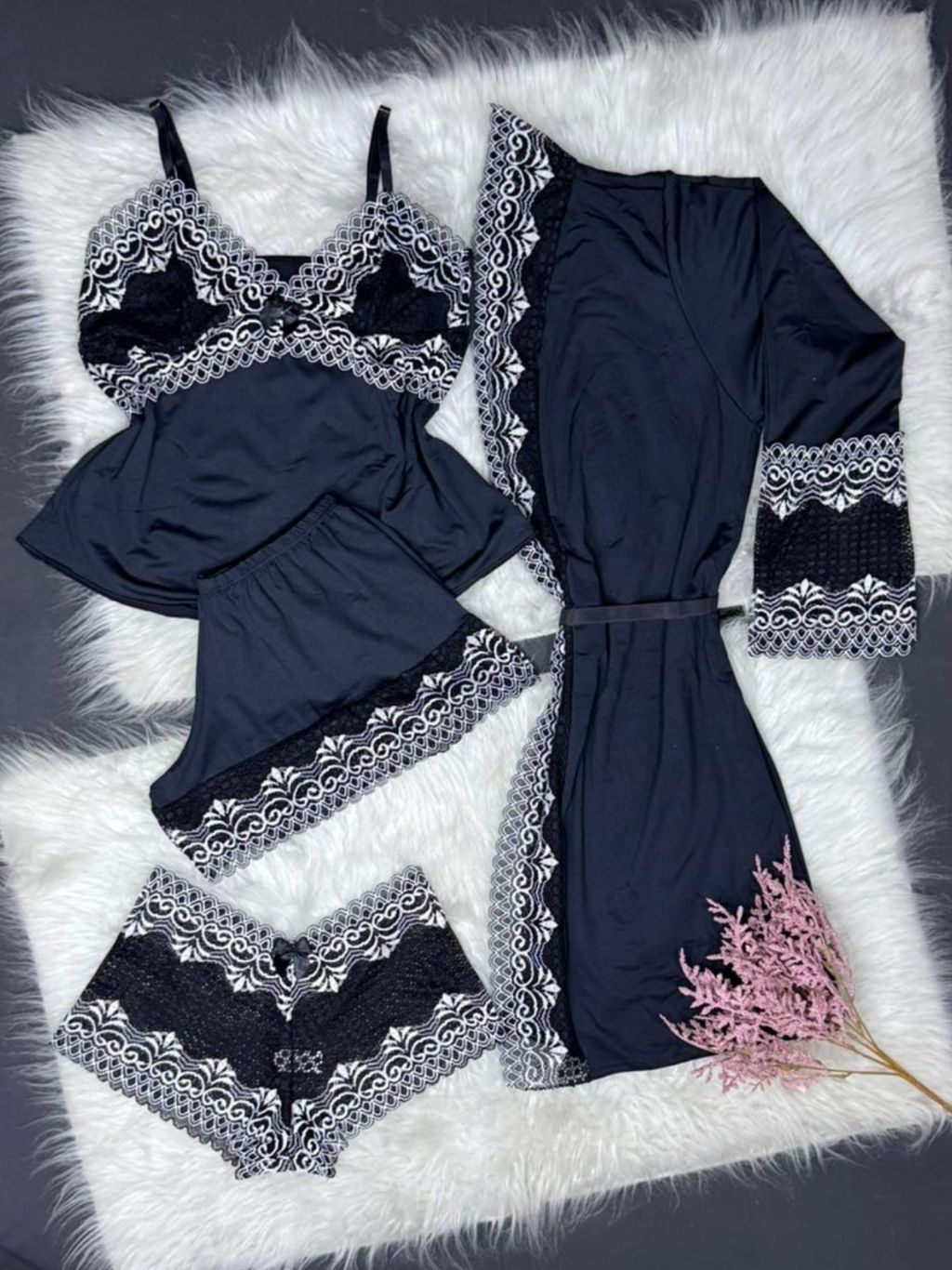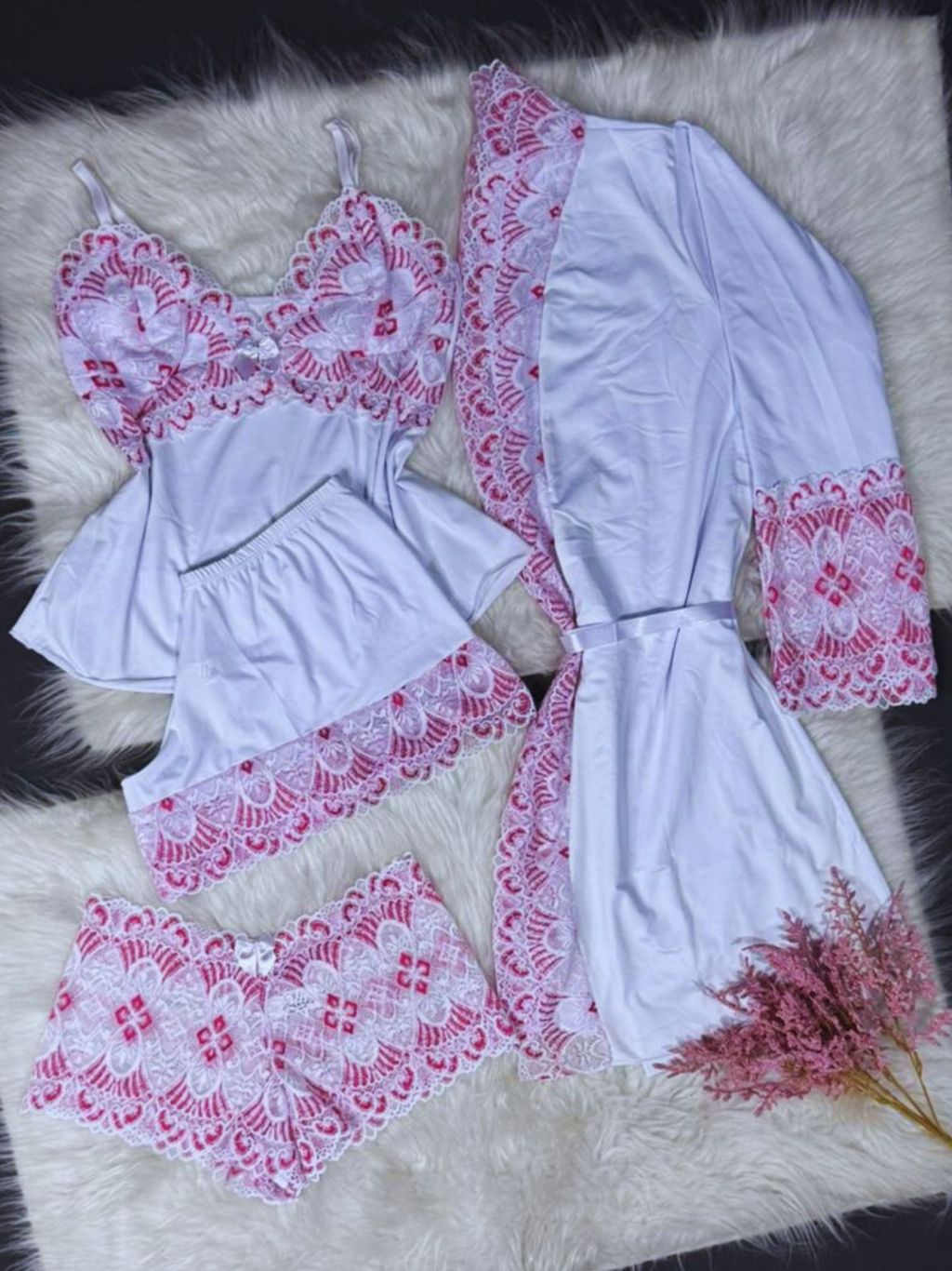 kit Noite de Luxo: 1 Robe + Babydoll + Calcinha Caleçon em Renda Bicolor