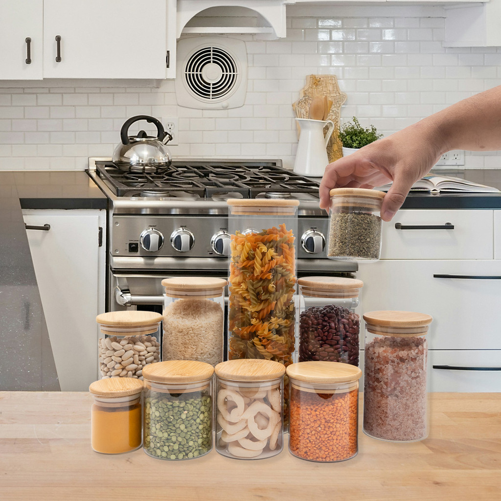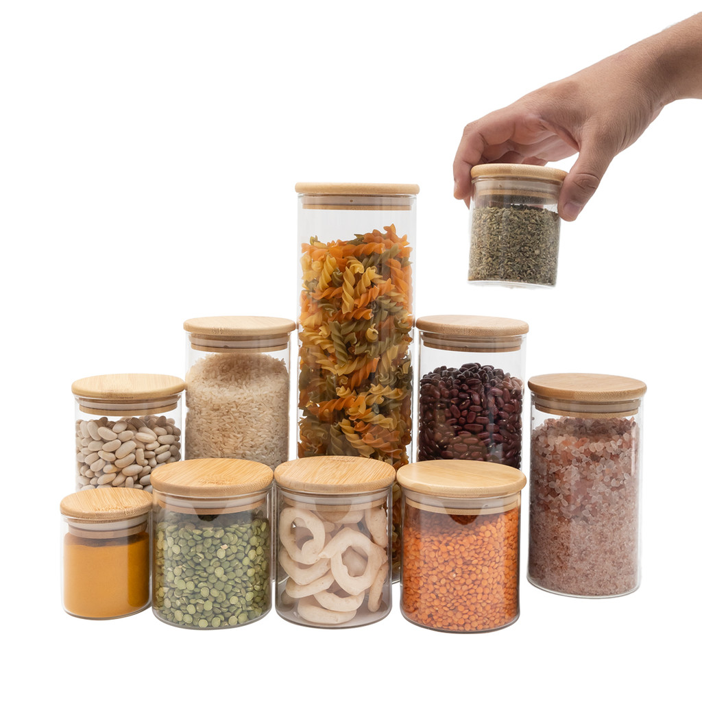 kit com 10 potes de vidro tampa de bambu hermético redondo mantimento - Oikos