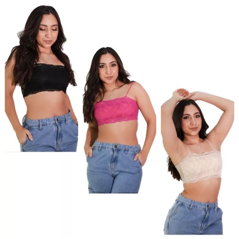 kit com 3 Top Faixa Renda Sem Bojo Cropped Rendado Moda Blogueira