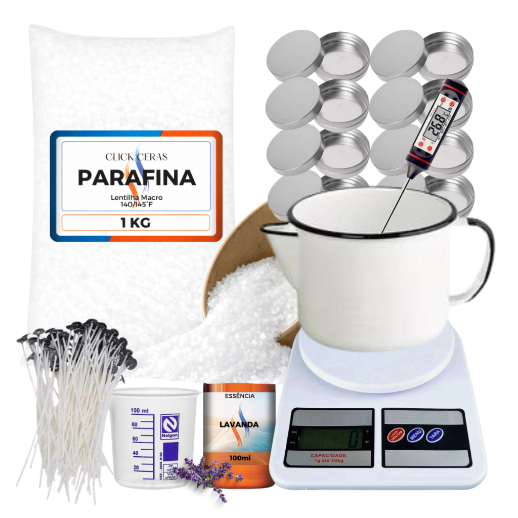 Kit Velas Aromáticas Completo 106 Itens Iniciante com Parafina 1kg + 50 Latinhas + 50 Pavios