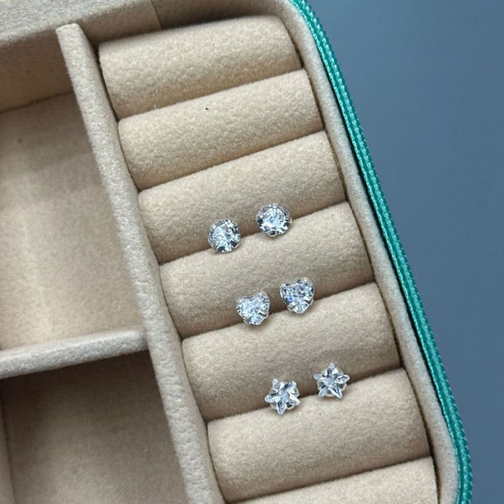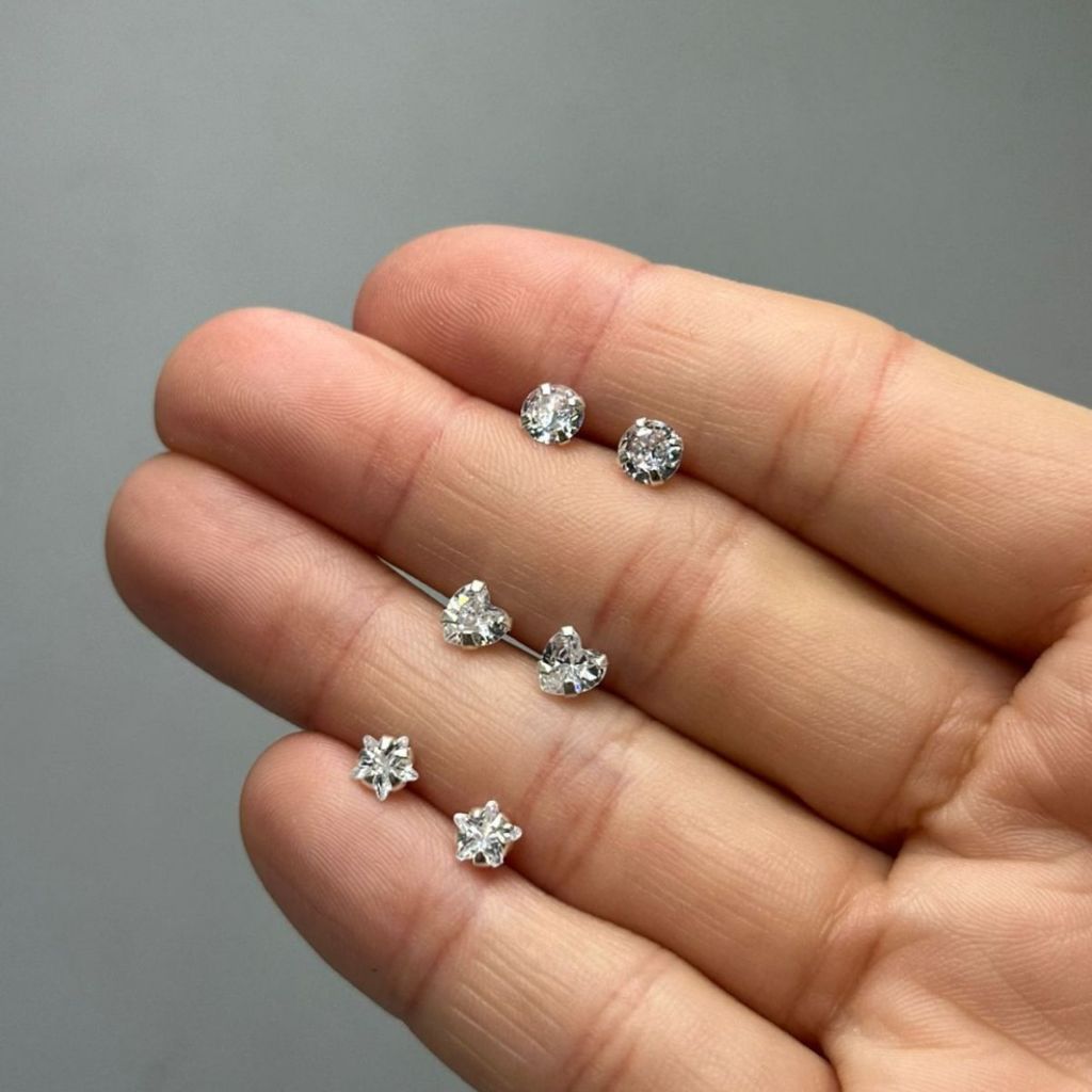 kit trio brincos prata 925 coração 5mm redondo 5mm estrela 5mm