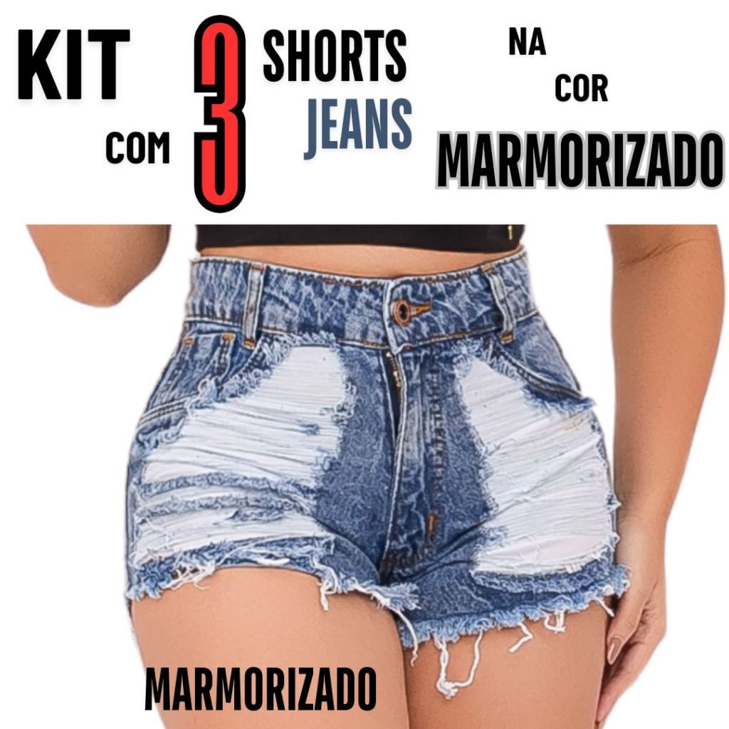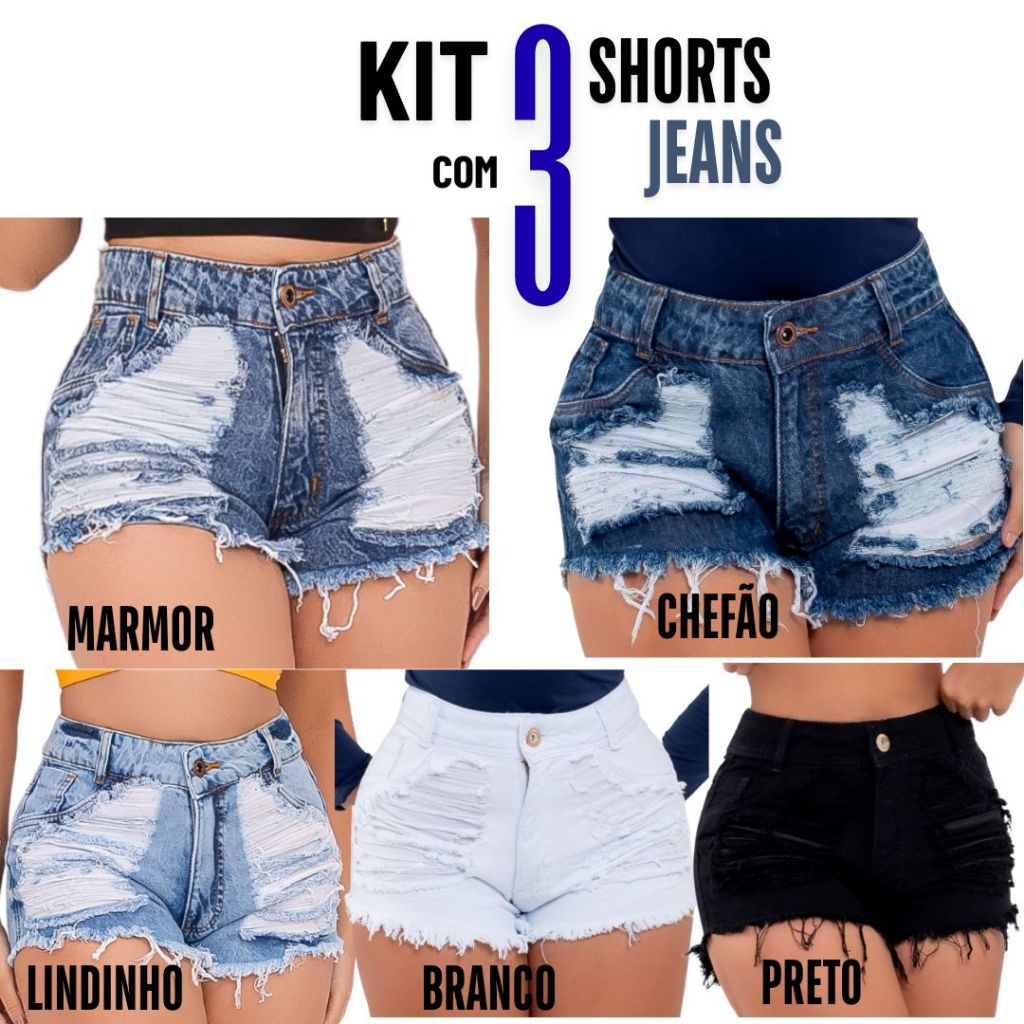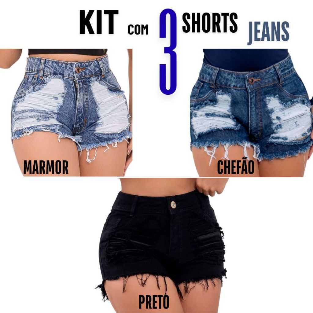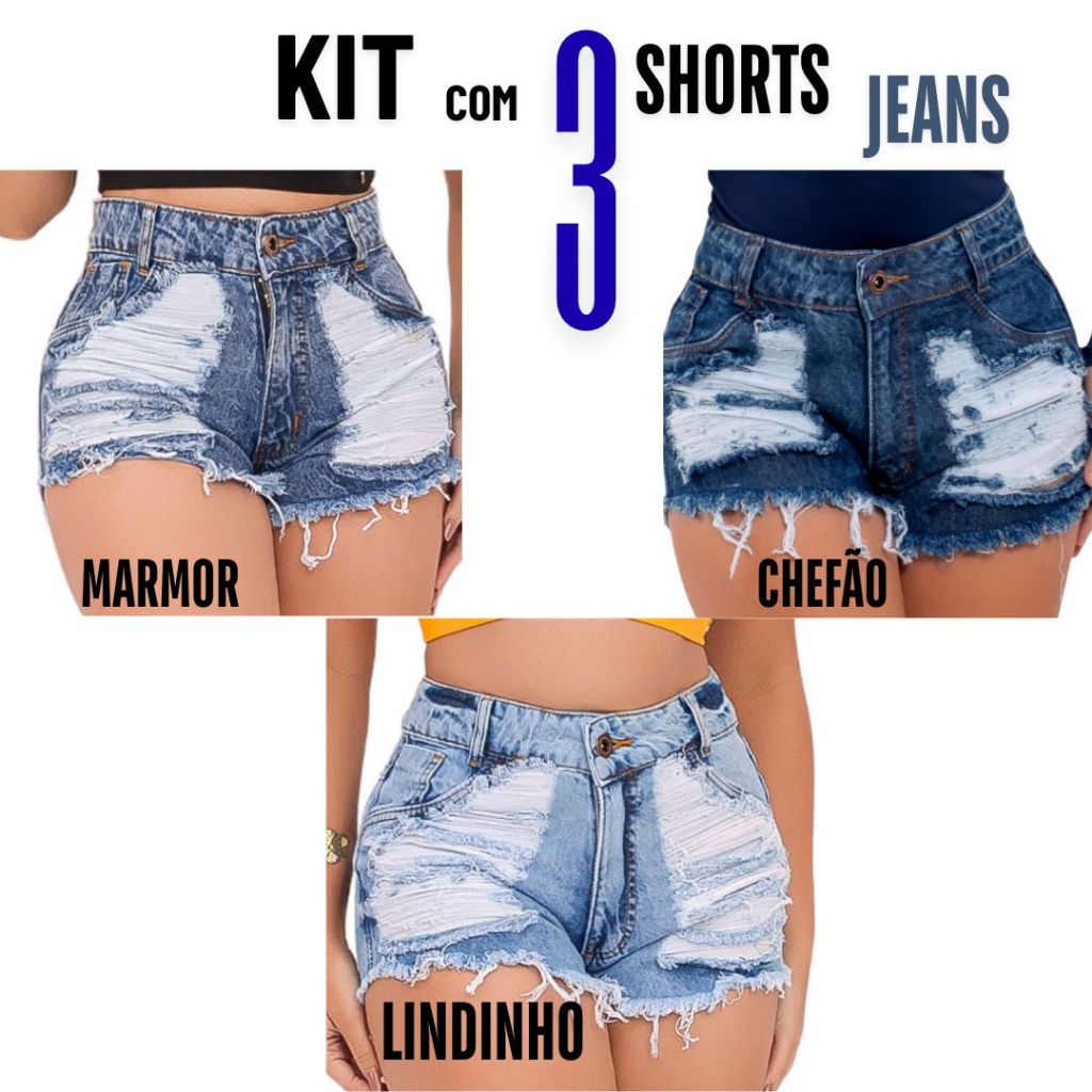 kits 3 Shorts Jeans Feminino Detonado Cintura Alta.