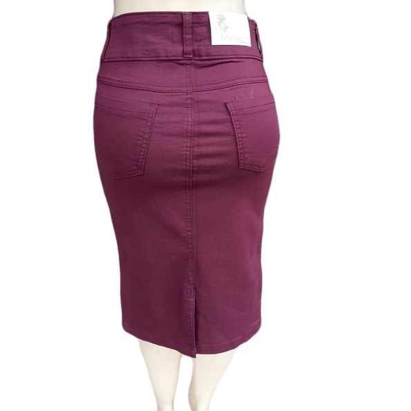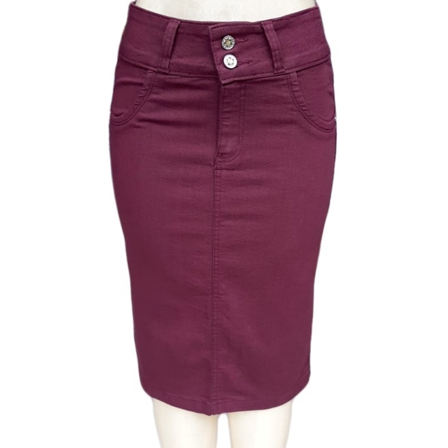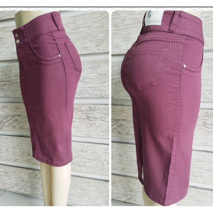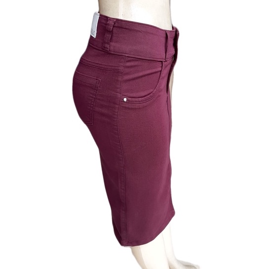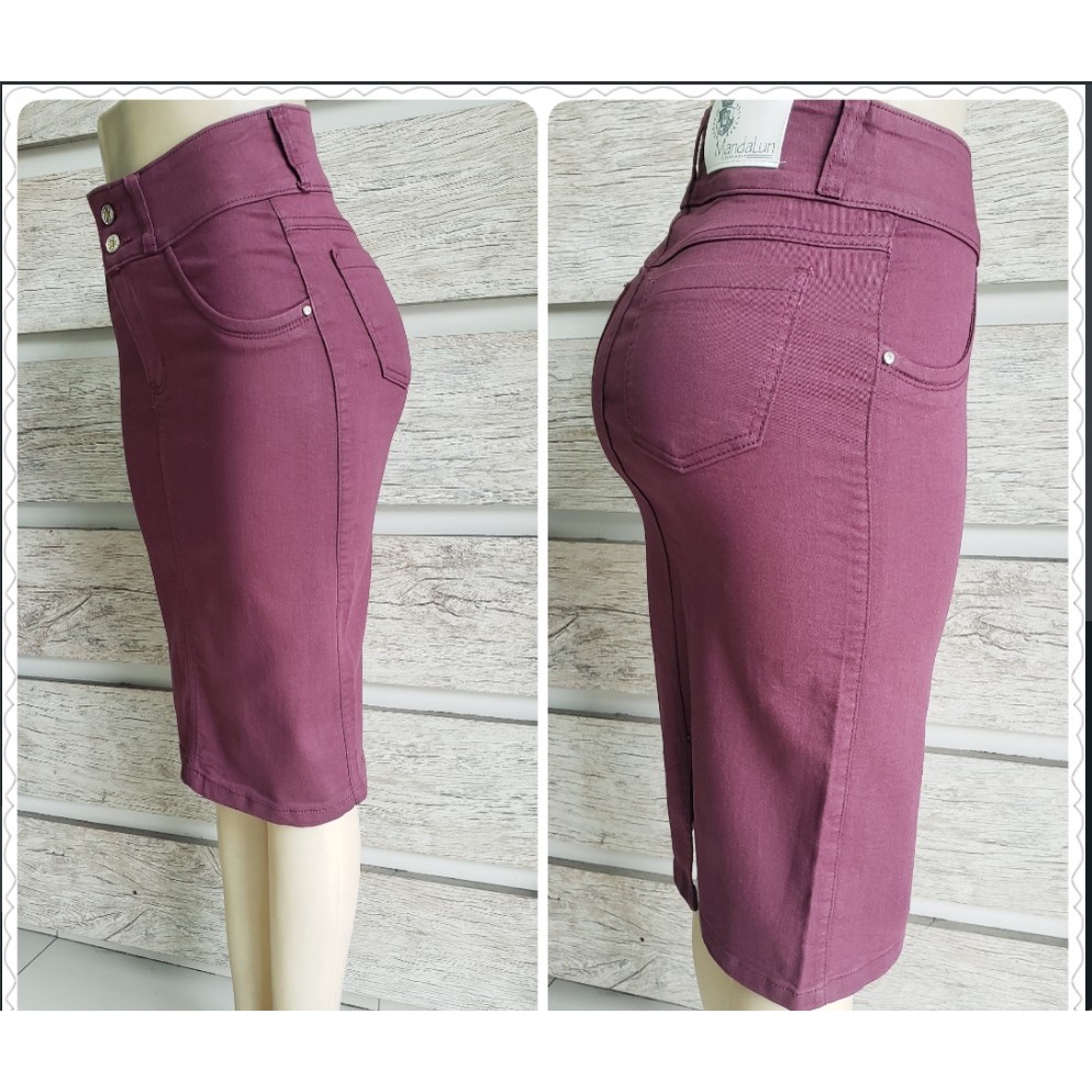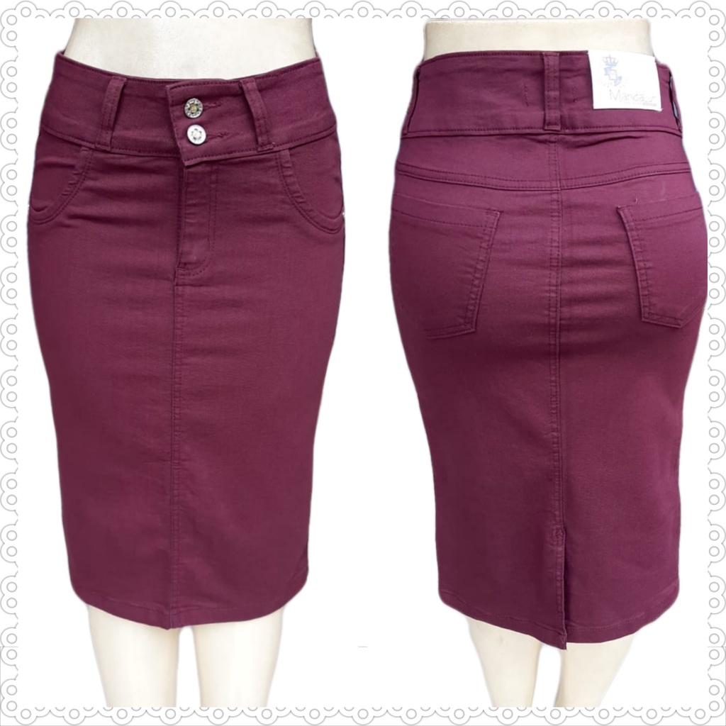 saia jeans cintura alta lançamento 2022 moda evangélica cor vinho