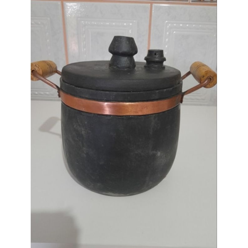 panela pressão pedra com alça de cobre e cabinho de madeira