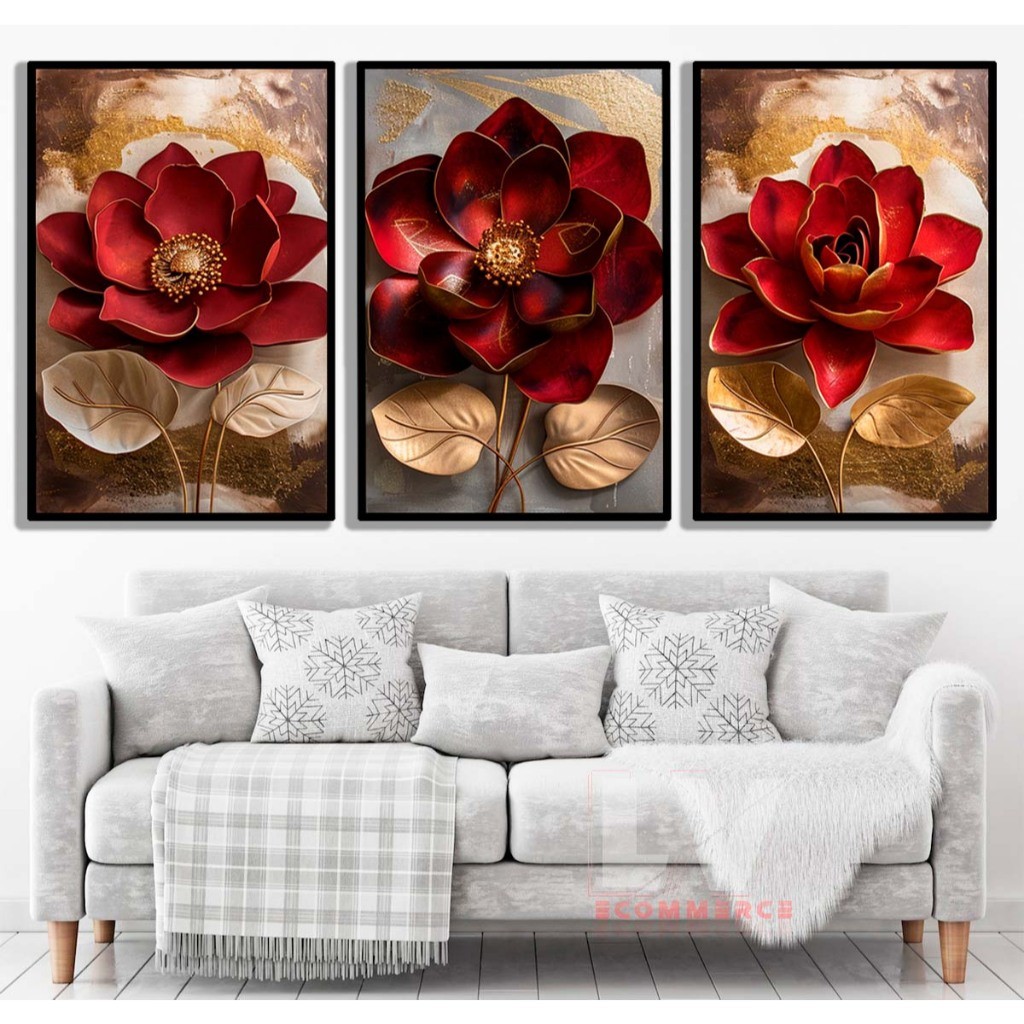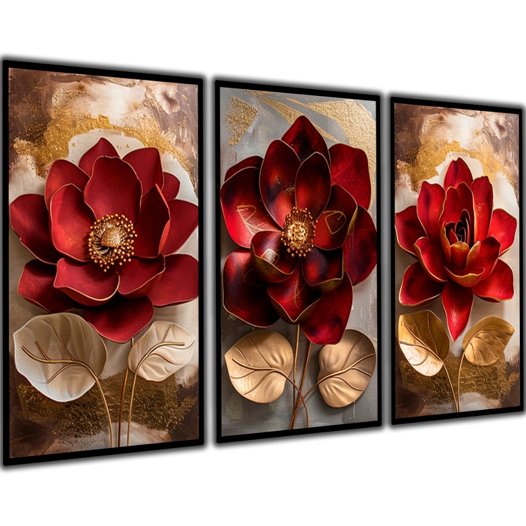 Quadros Grande Rosa Vermelha Jardim Gold 3 Peça Sala 122x60 Sala Quarto