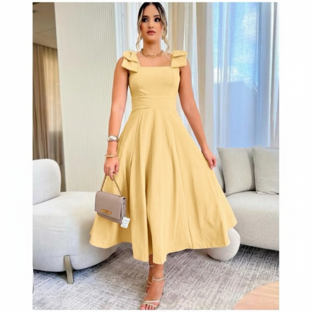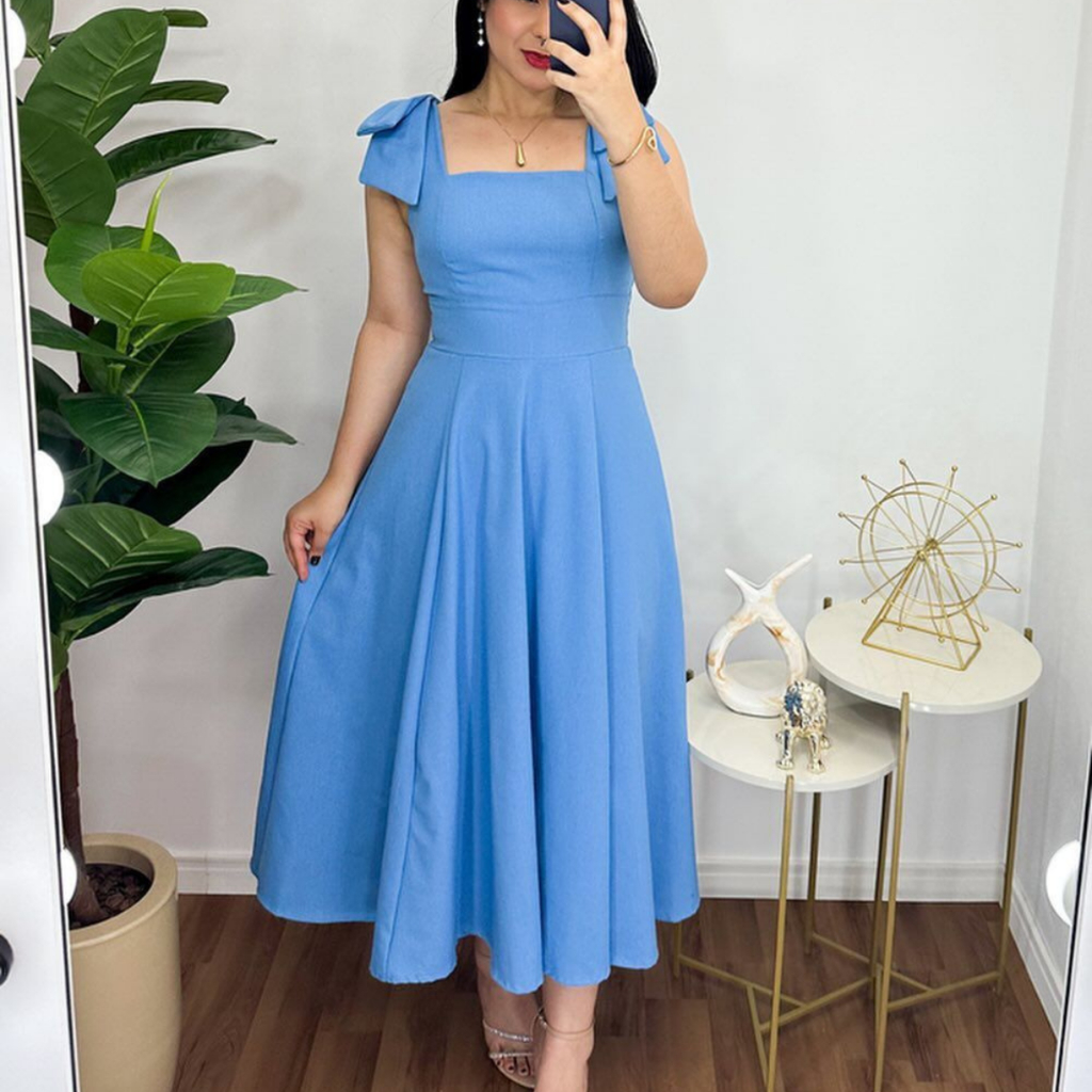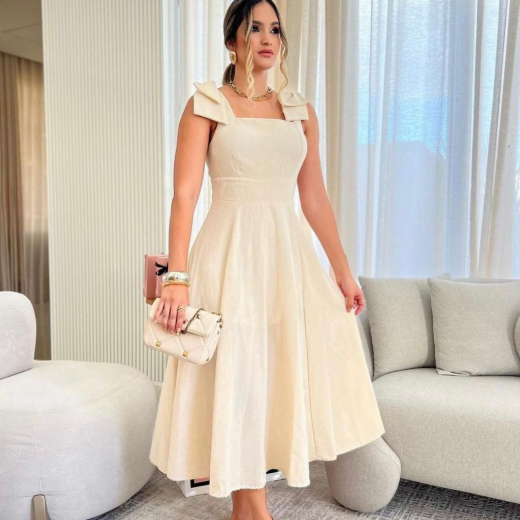 Vestido Feminino de Linho Luxo Para Festa Midi Com Laço no Ombro