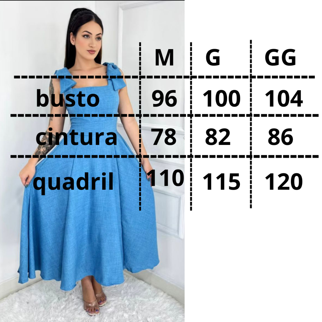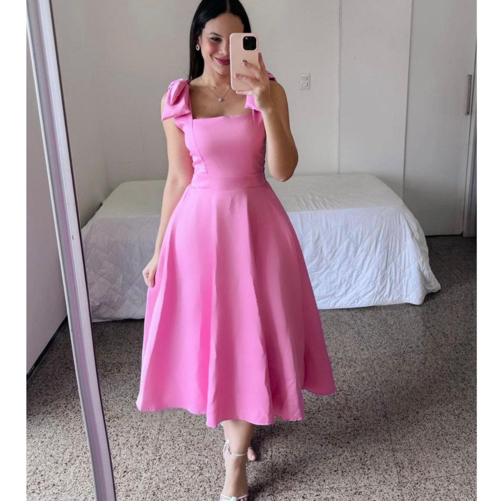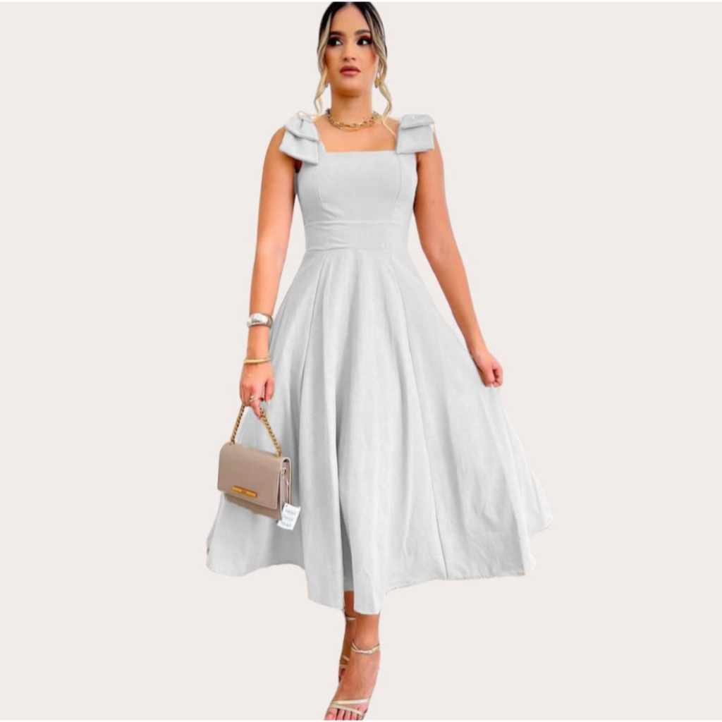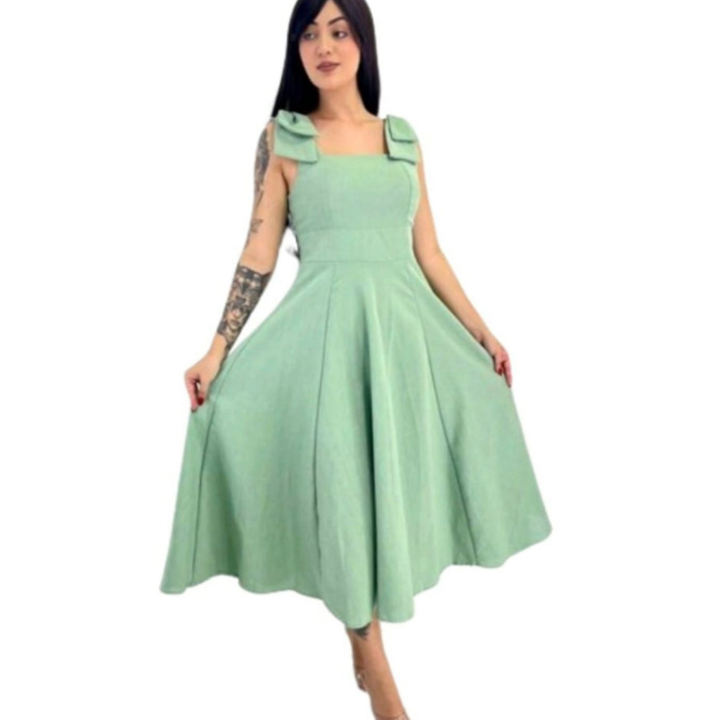 Vestido Feminino de Linho Luxo Para Festa Midi Com Laço no Ombro