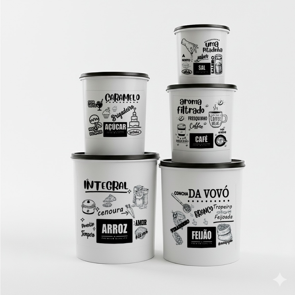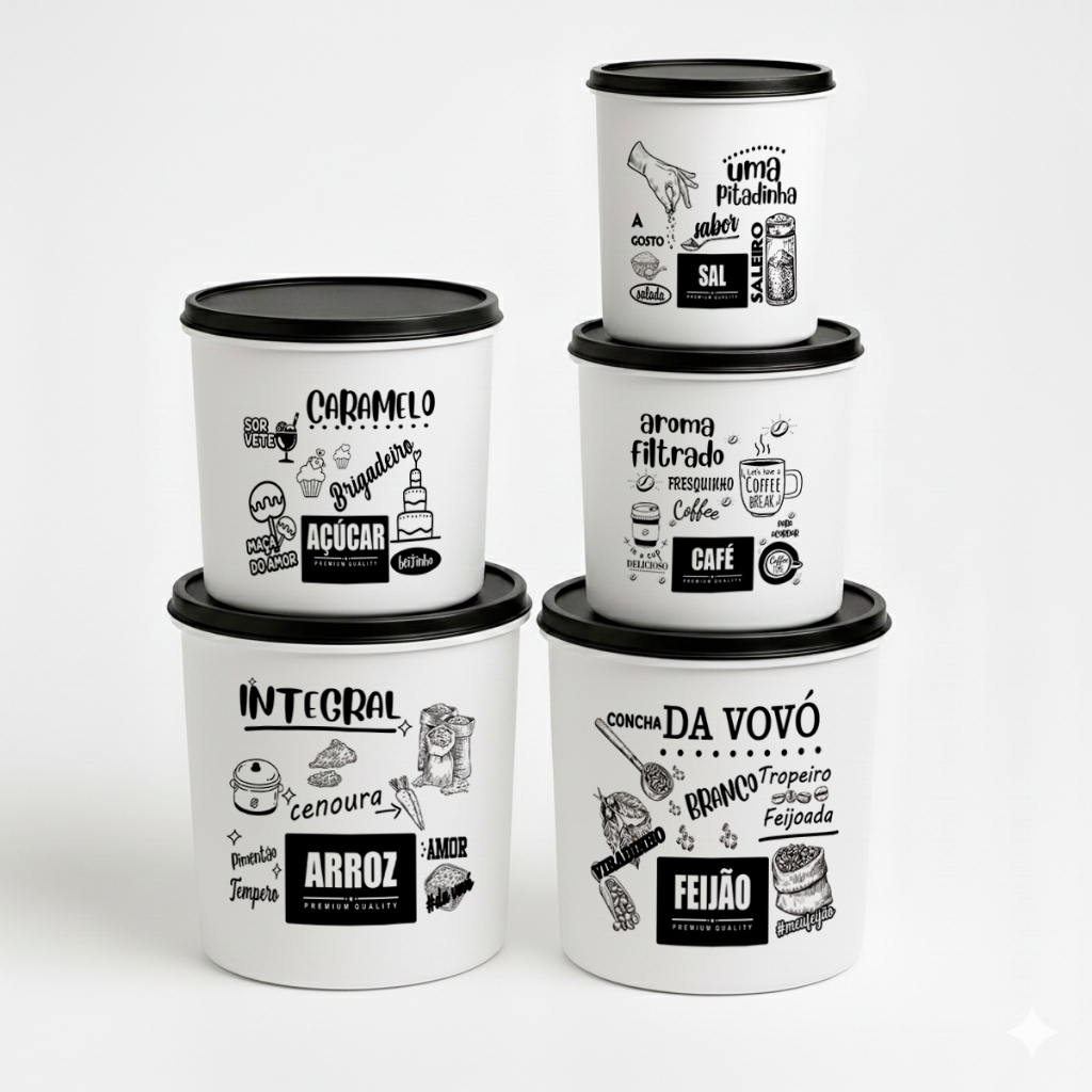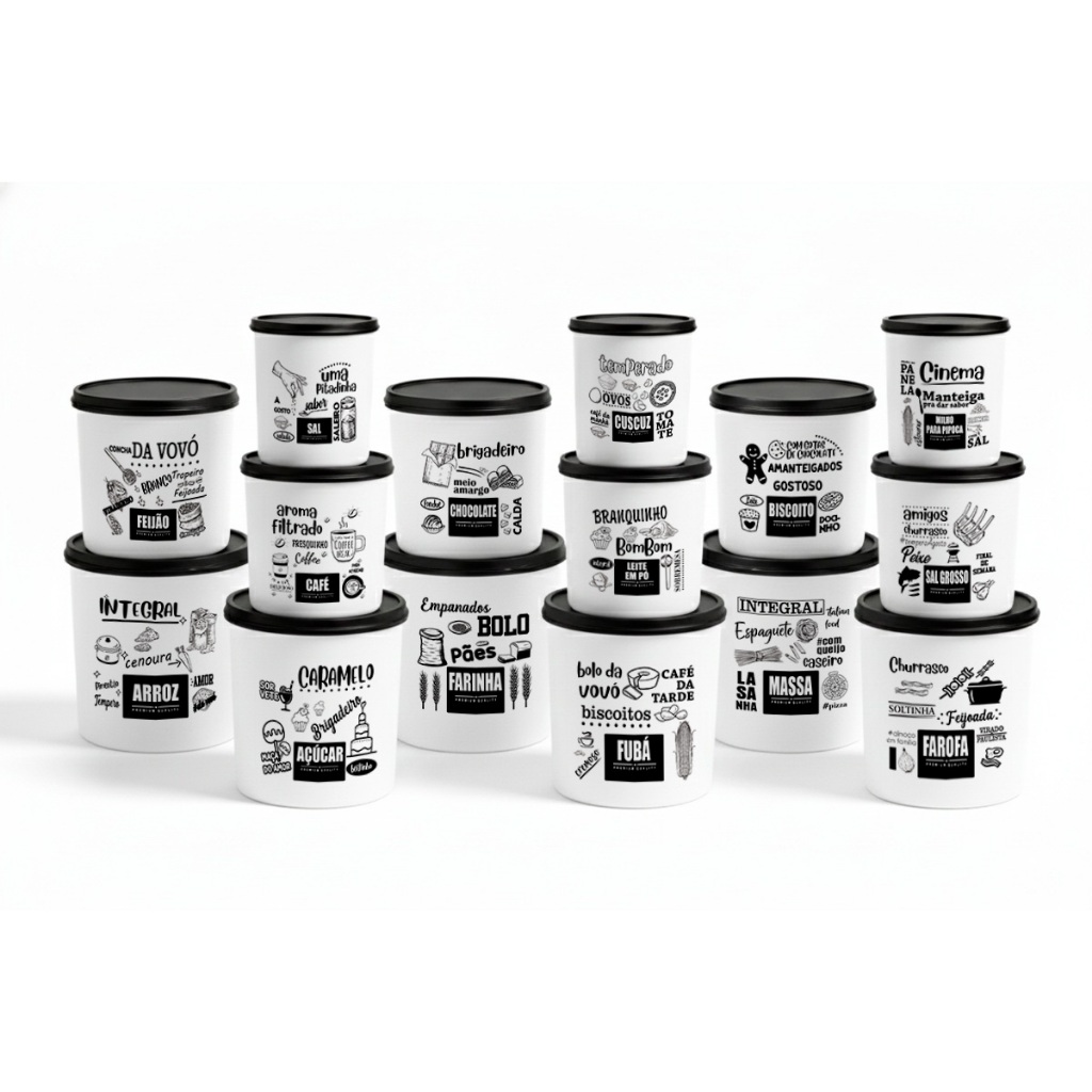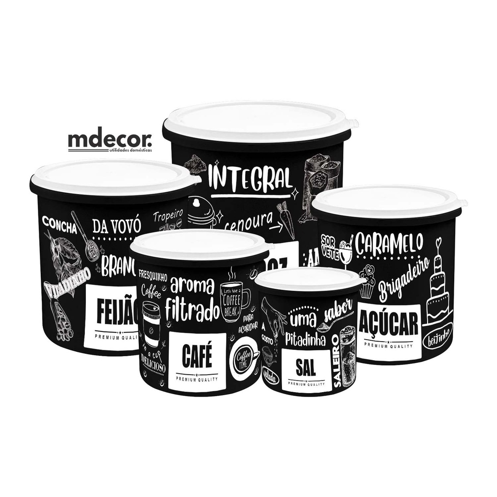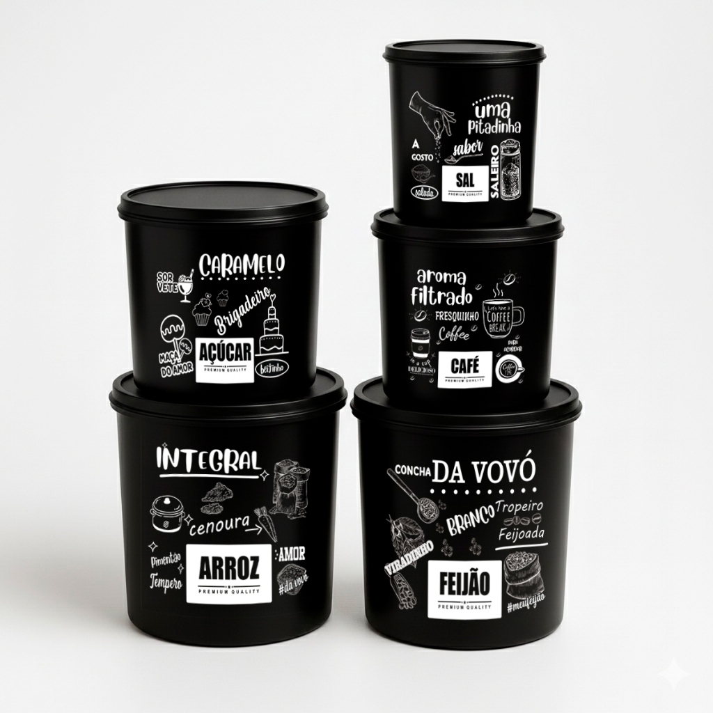 Kit 5 Potes de Mantimentos Plástico Preto PB Frases