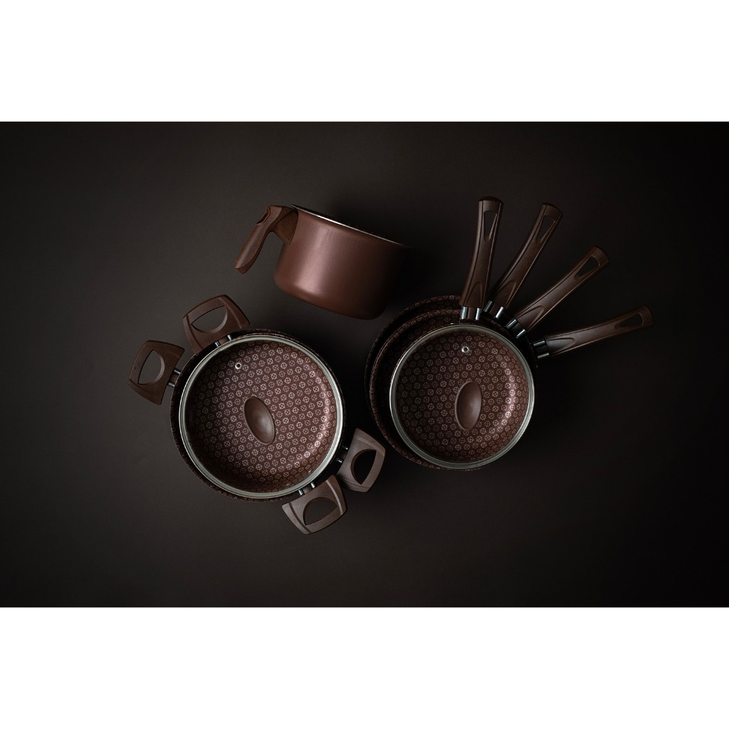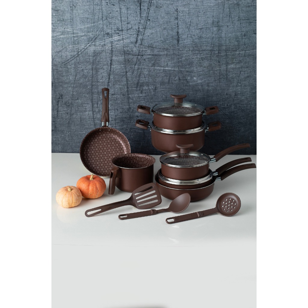Jogo de Panelas Antiaderente 10 Peças com Tampa de Vidro e Utensílios | Marrom Premium