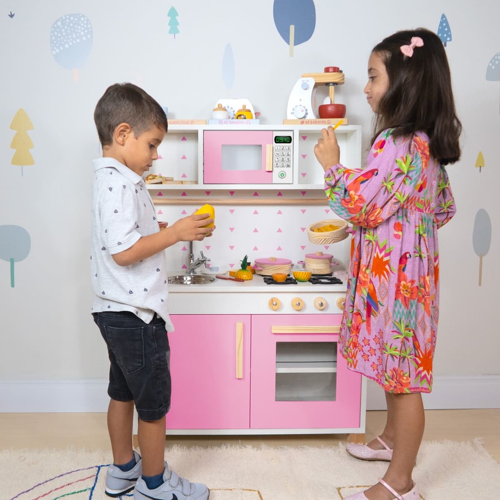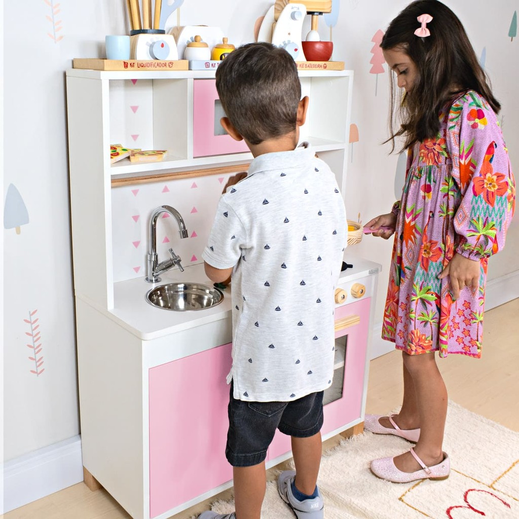 Kit Educativo Cozinha Infantil Pia Fogão Microondas Madeira Rosa Brinquedo