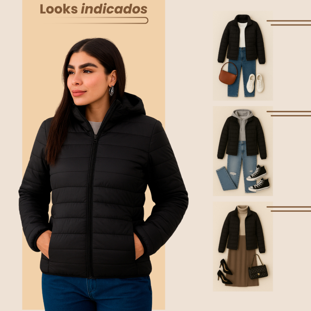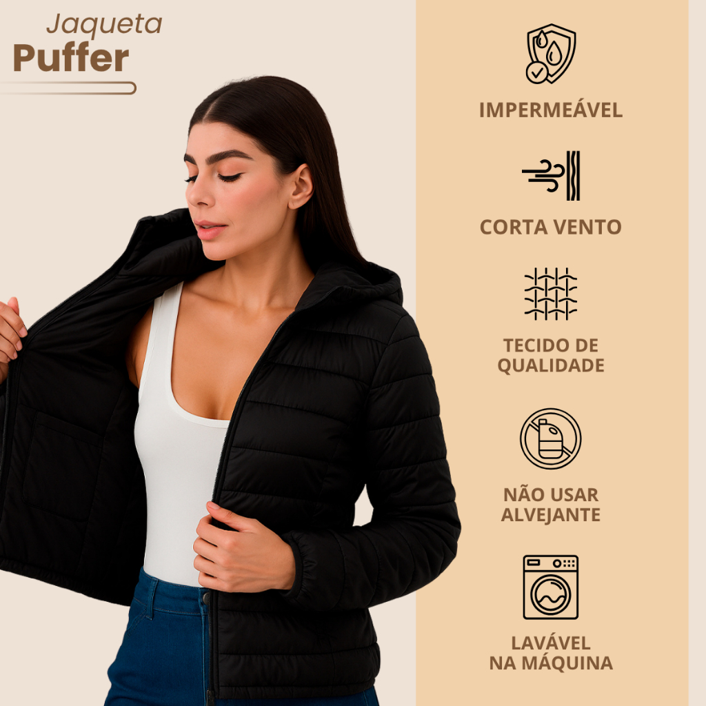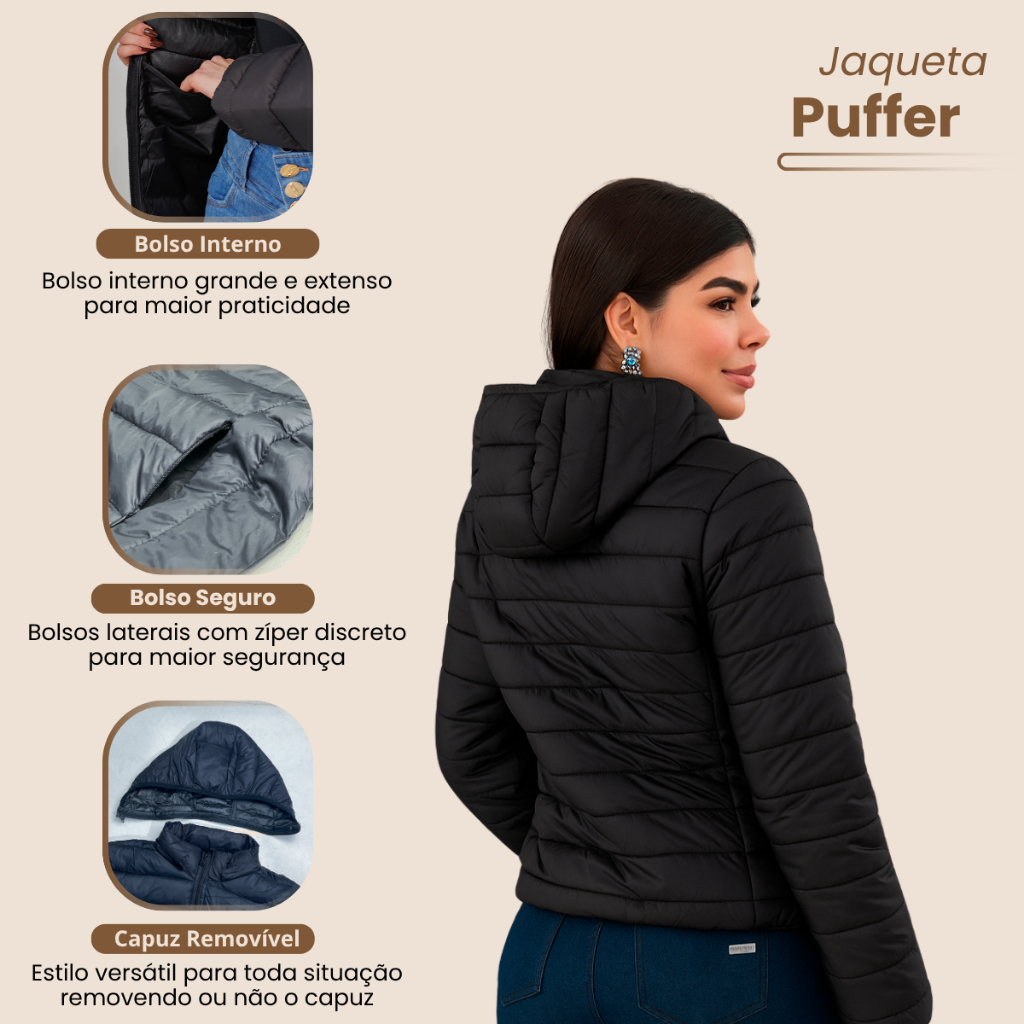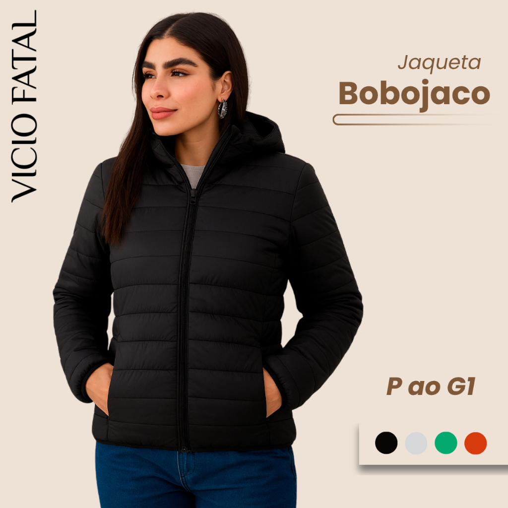 Jaqueta Feminina Bobojaco Puffer com Capuz Removível Nylon Repele Líquido Manga Longa Bolsos