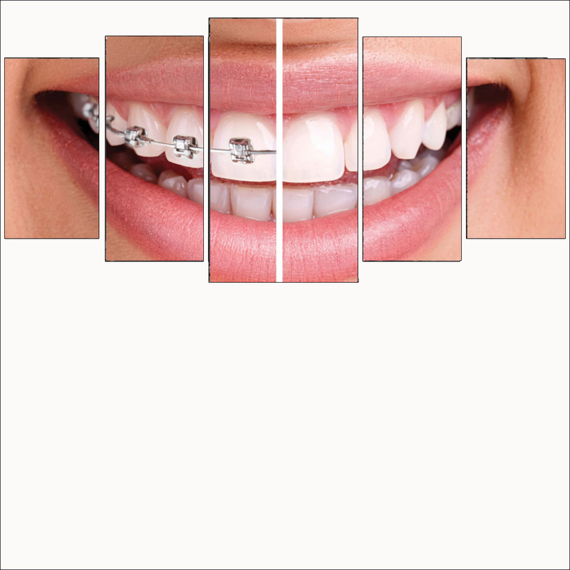 kit Quadro Decorativo Moderno 5 Peças 128x60 Consultório Odontológico Sorriso Aparelho Ortodôntico