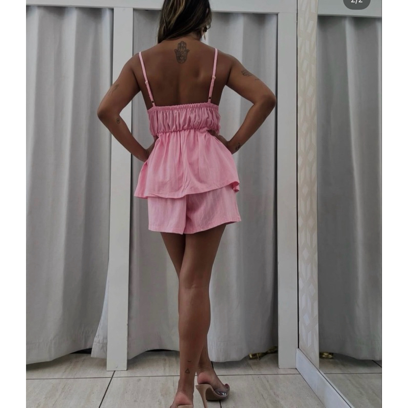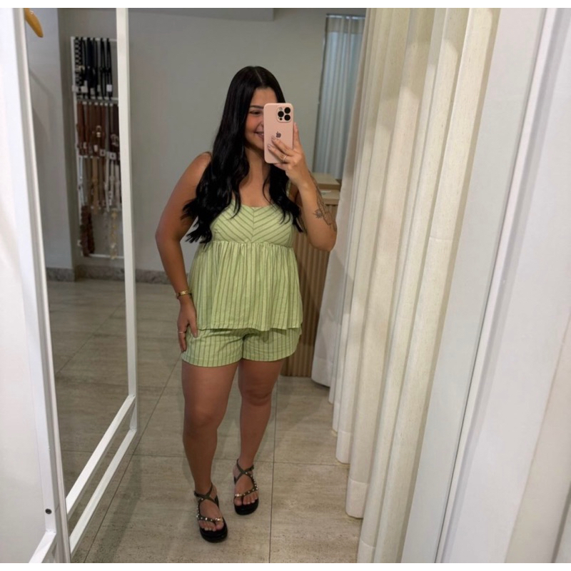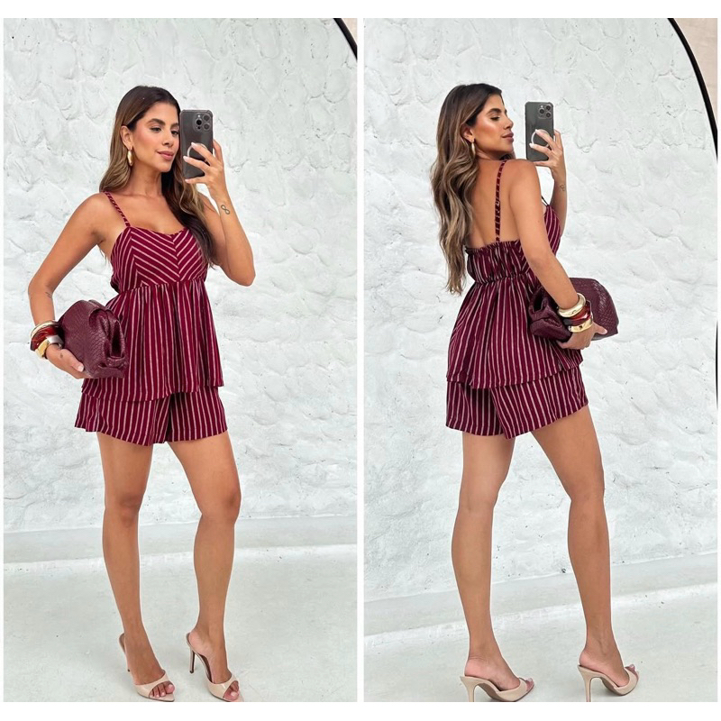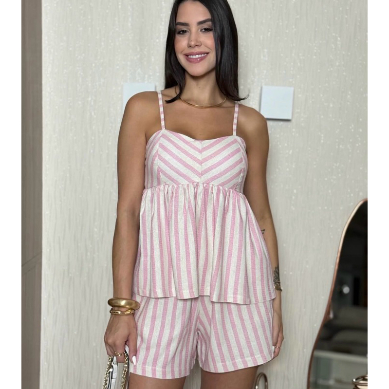 Conjunto Soltinho Risca de Giz short e Bata Feminino Leve Elegante