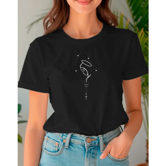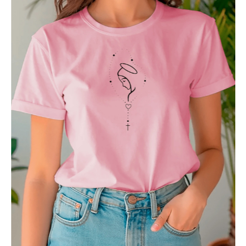 Camisa Camiseta Feminina Minimalista Estampa Maria Terço Religiosa Cristã Fé Algodão 100% Fio 30.1