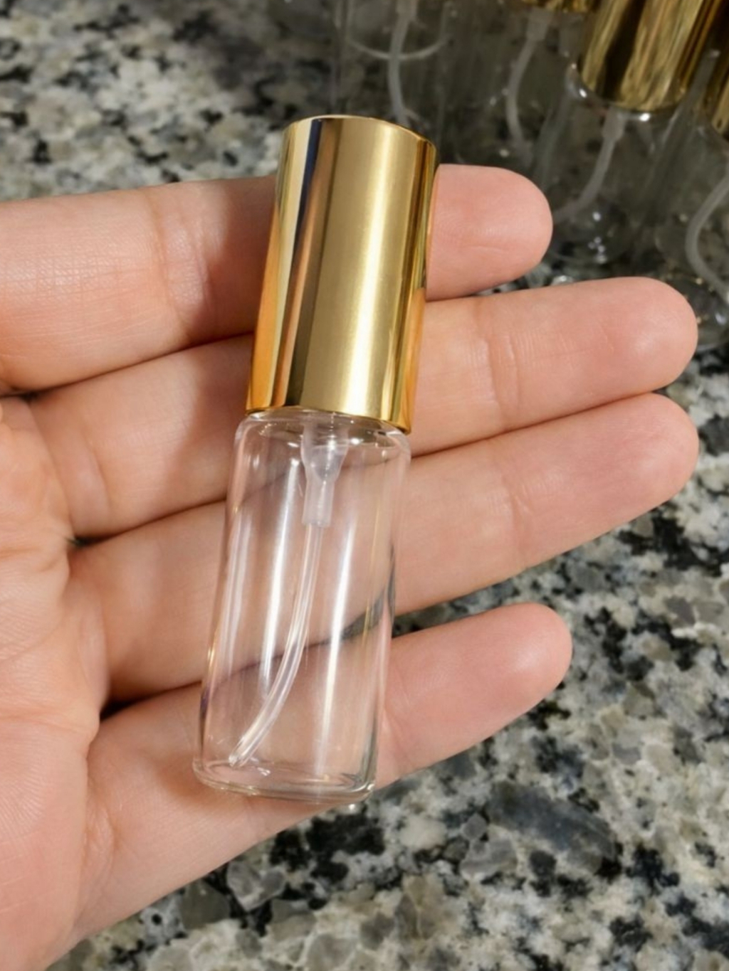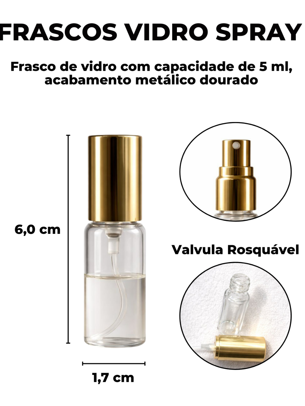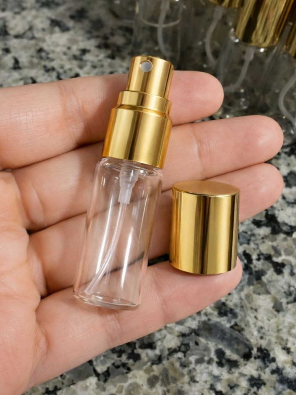 Kit Com 50/100 Frascos De Vidro 5 ML Válvula Spray Acabamento Ouro Boca 13 mm Para Perfumes Colonia