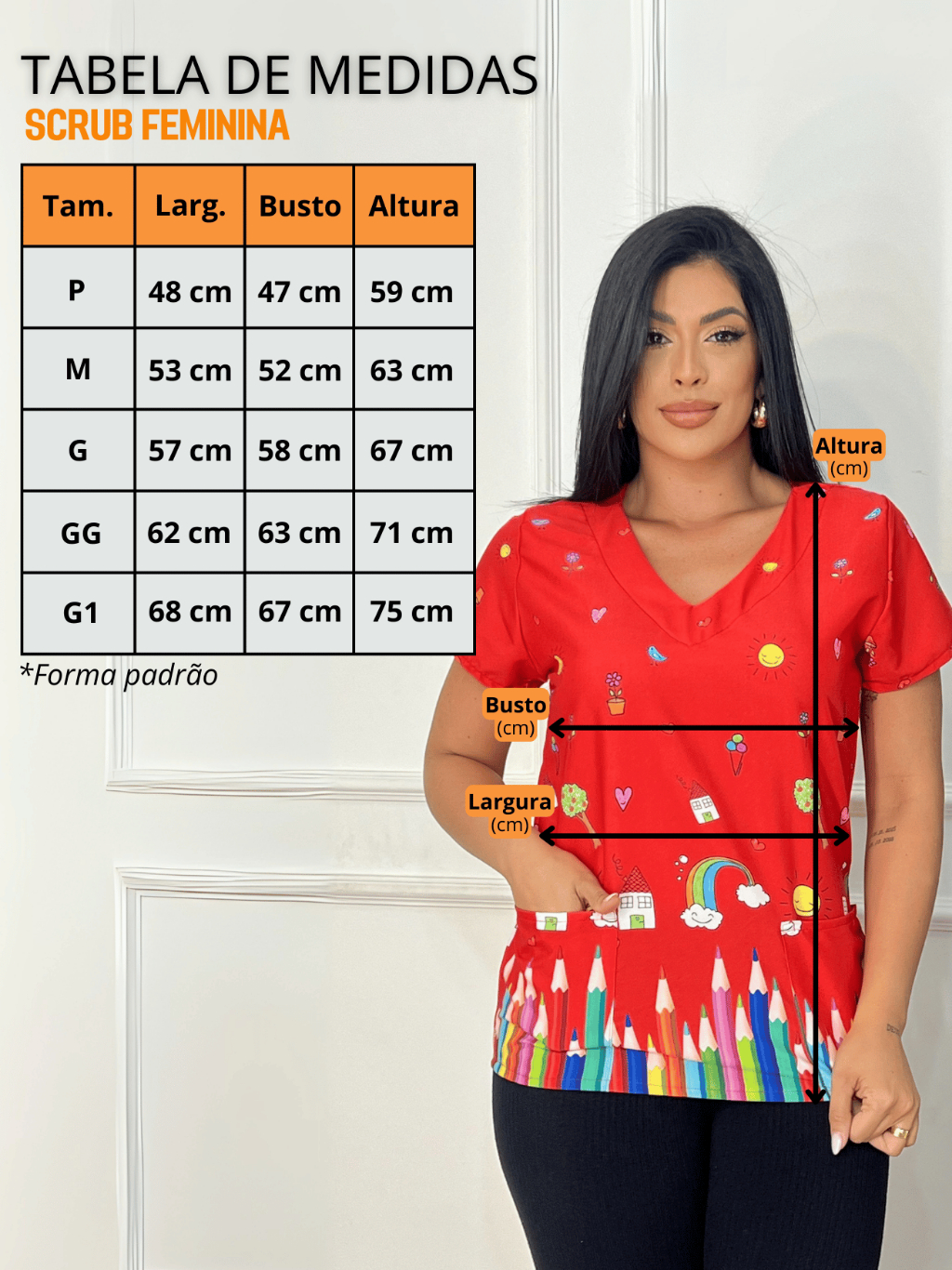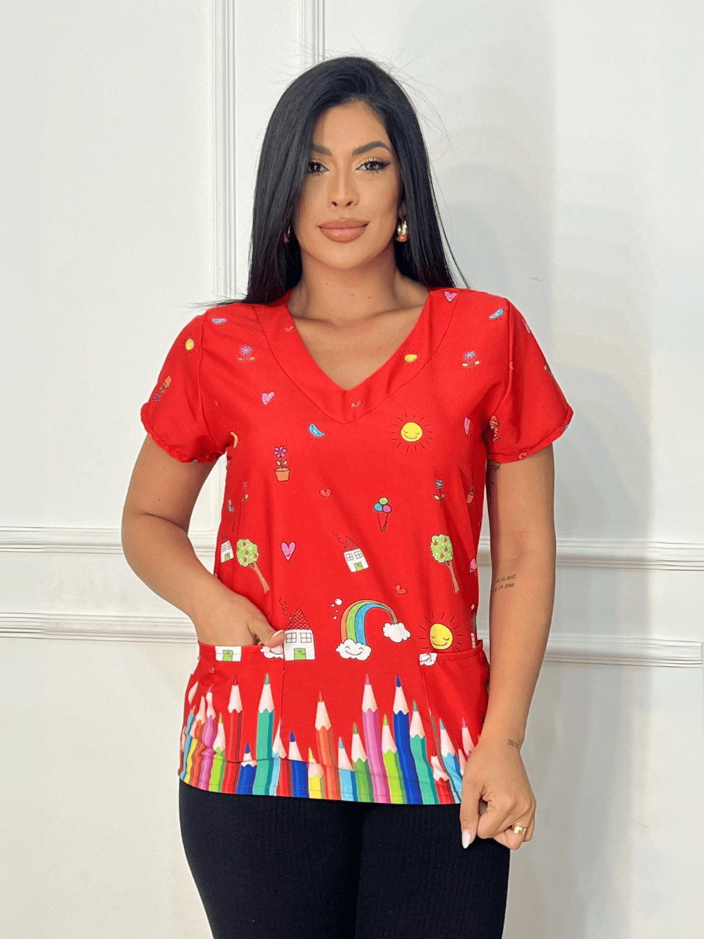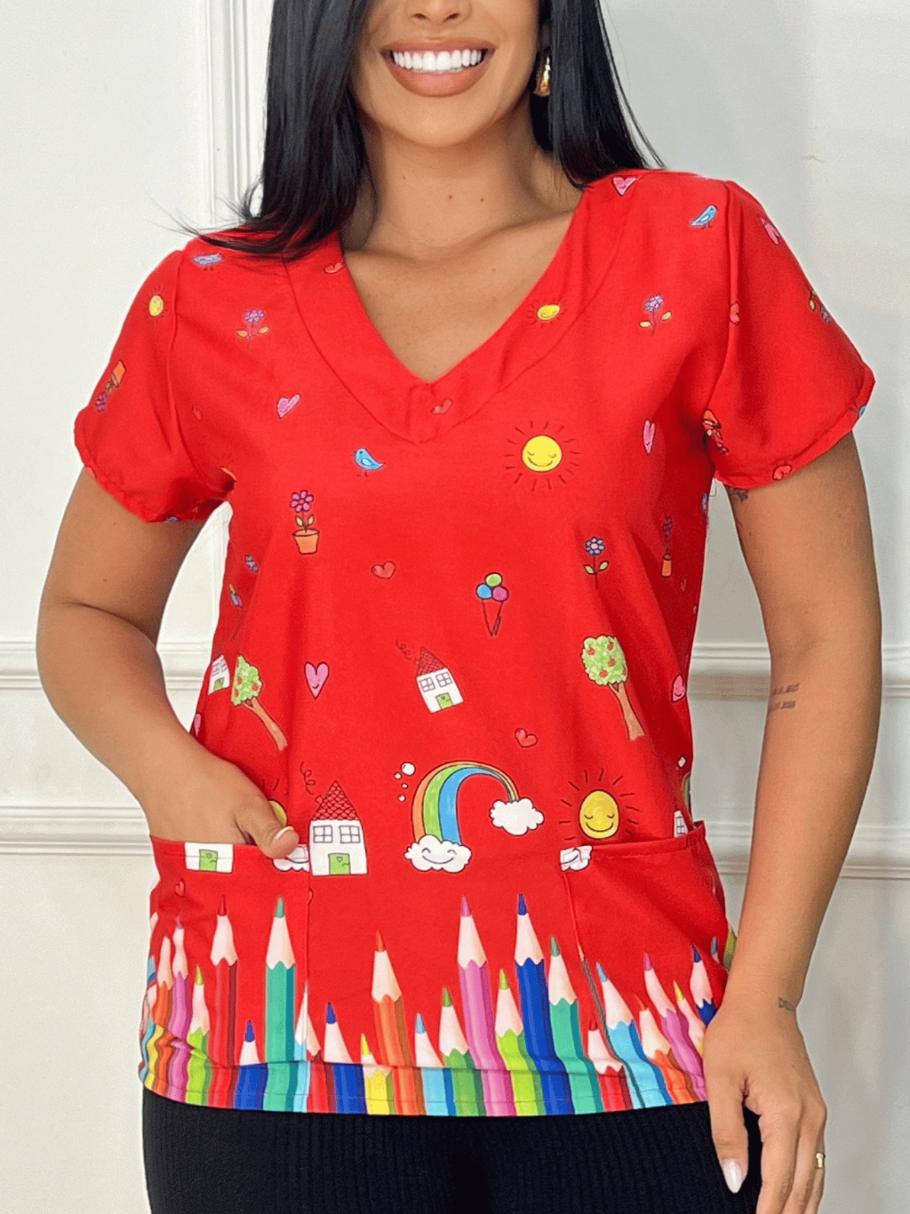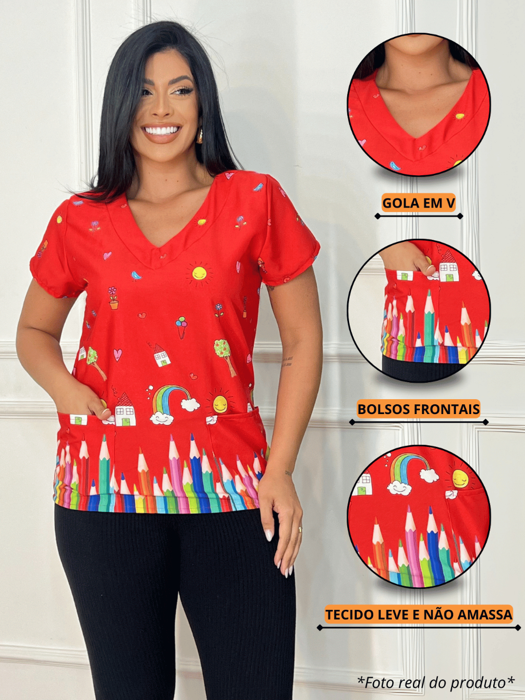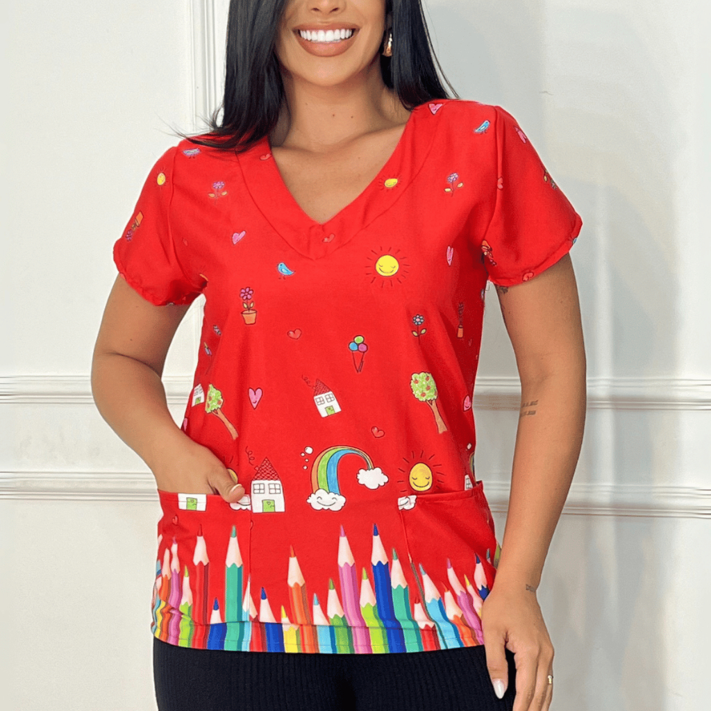Blusa Bata Scrubs Feminina Baby Look Educação Vermelha