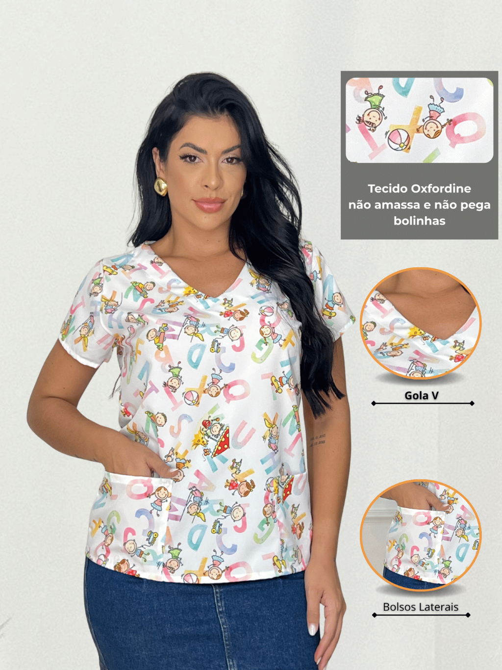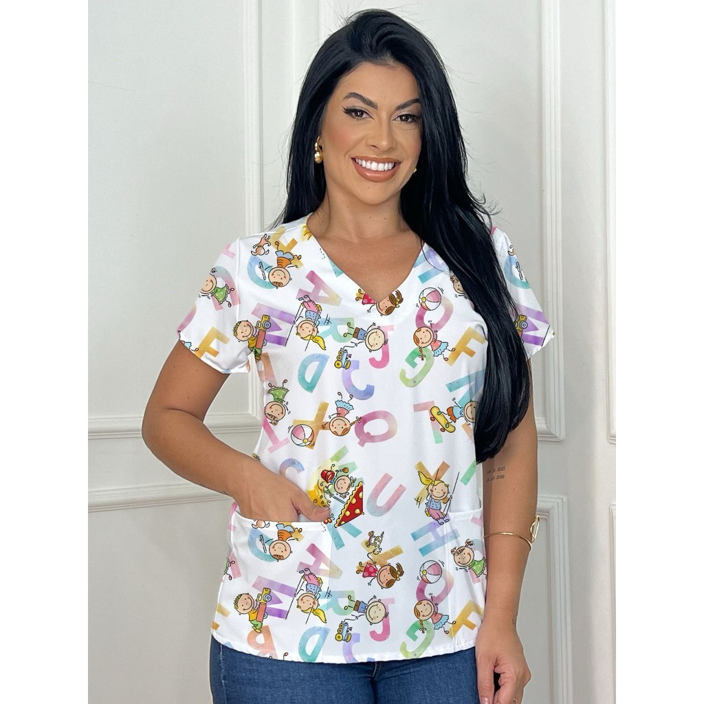Blusa Bata Scrubs Feminina Baby Look Profissões Educação Infantil