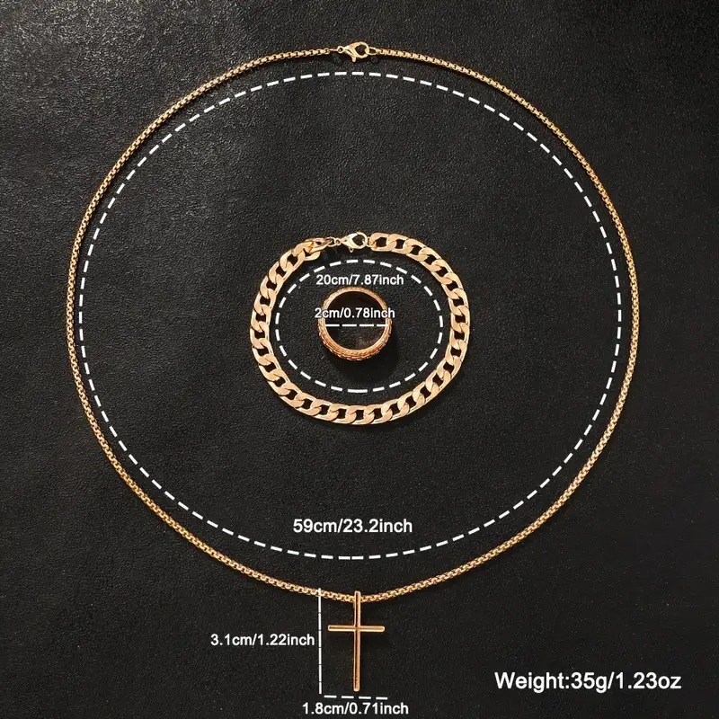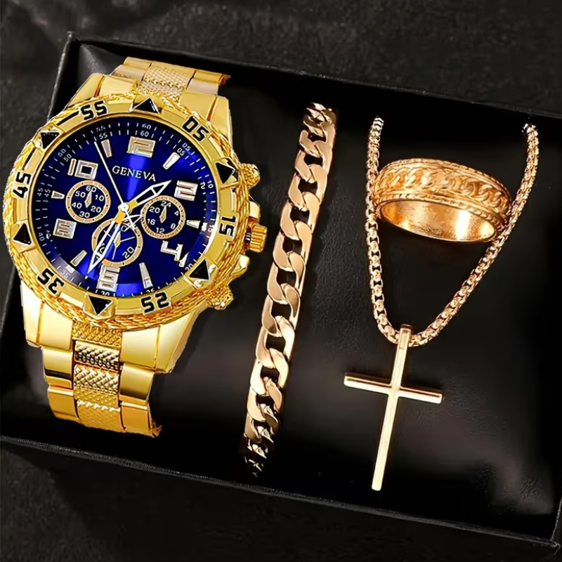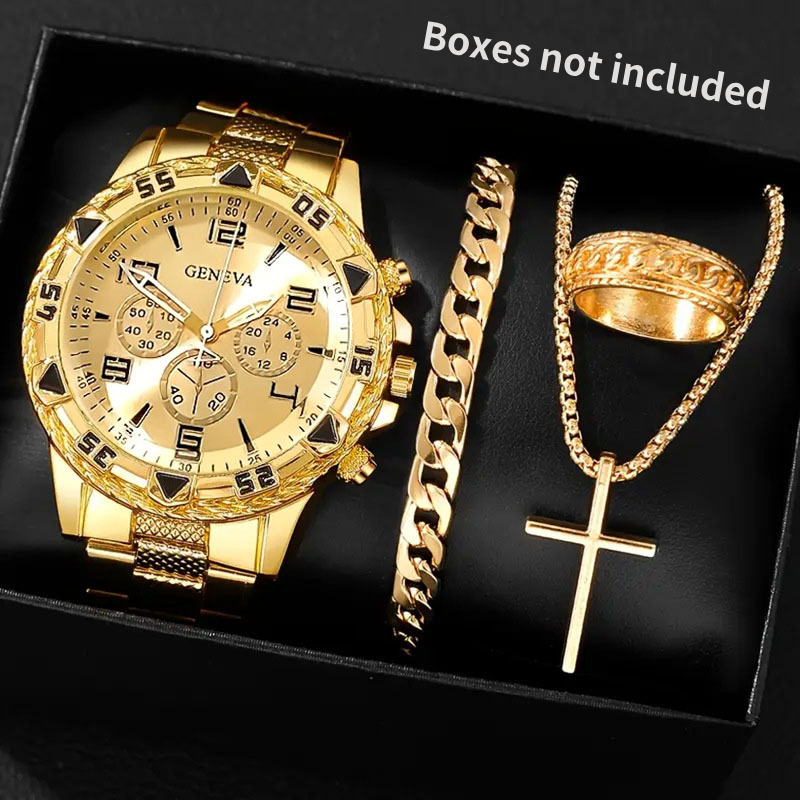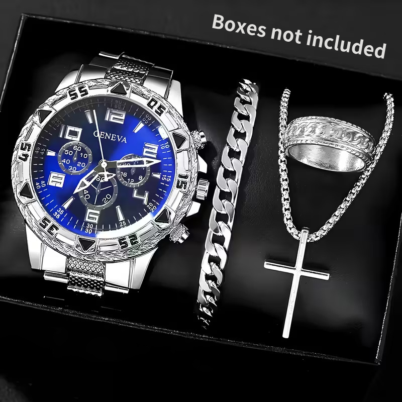 Conjunto De Relógio Masculino , 4 Unidades , Moda Casual , Aço Inoxidável , Três Mostradores , De Quartzo Com Colar Cruz