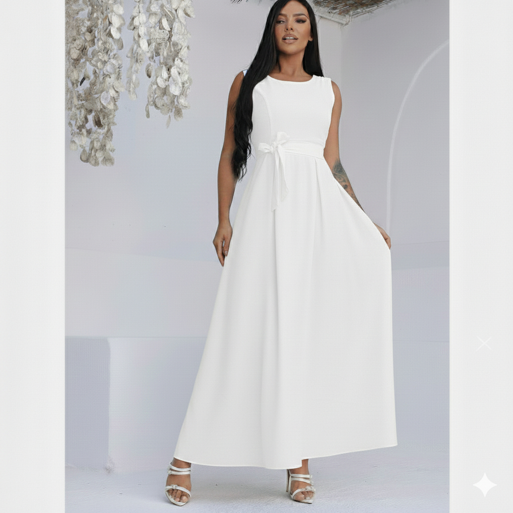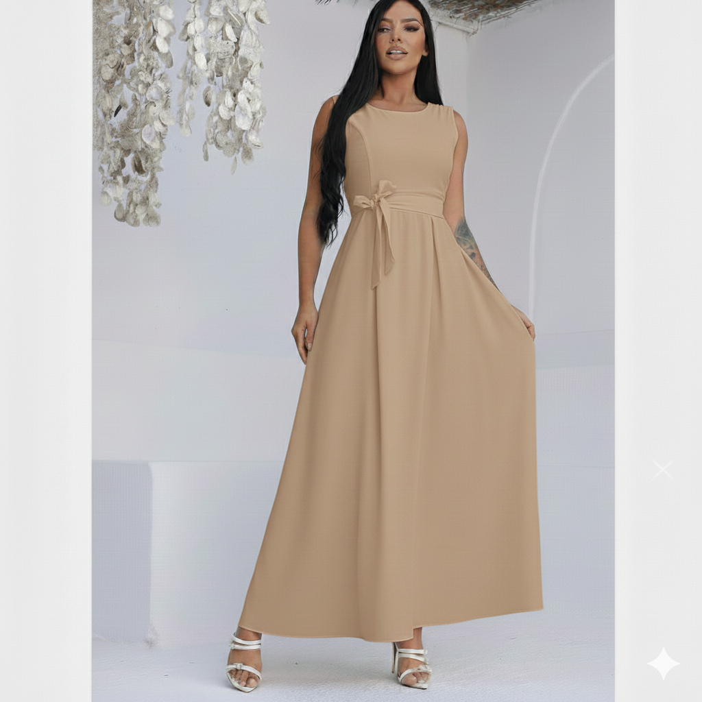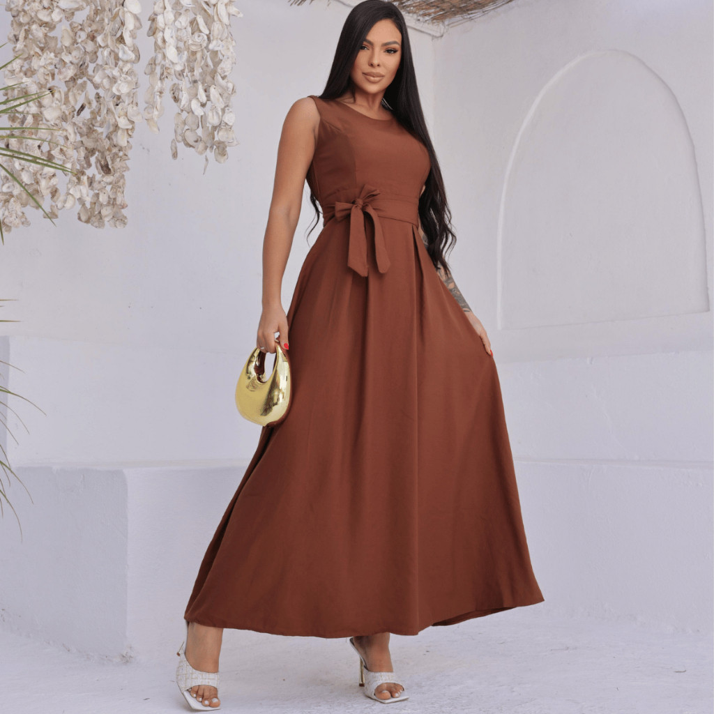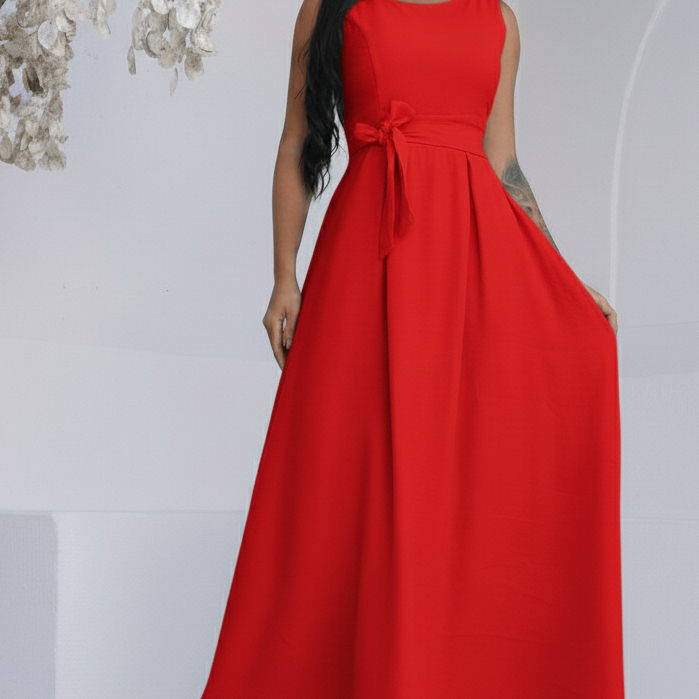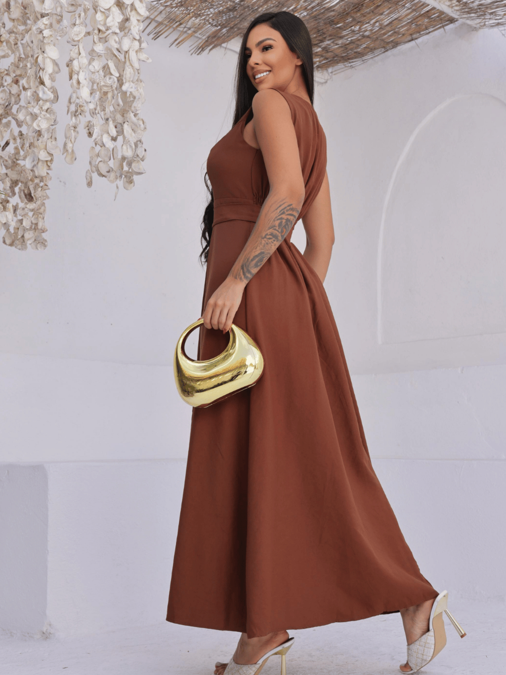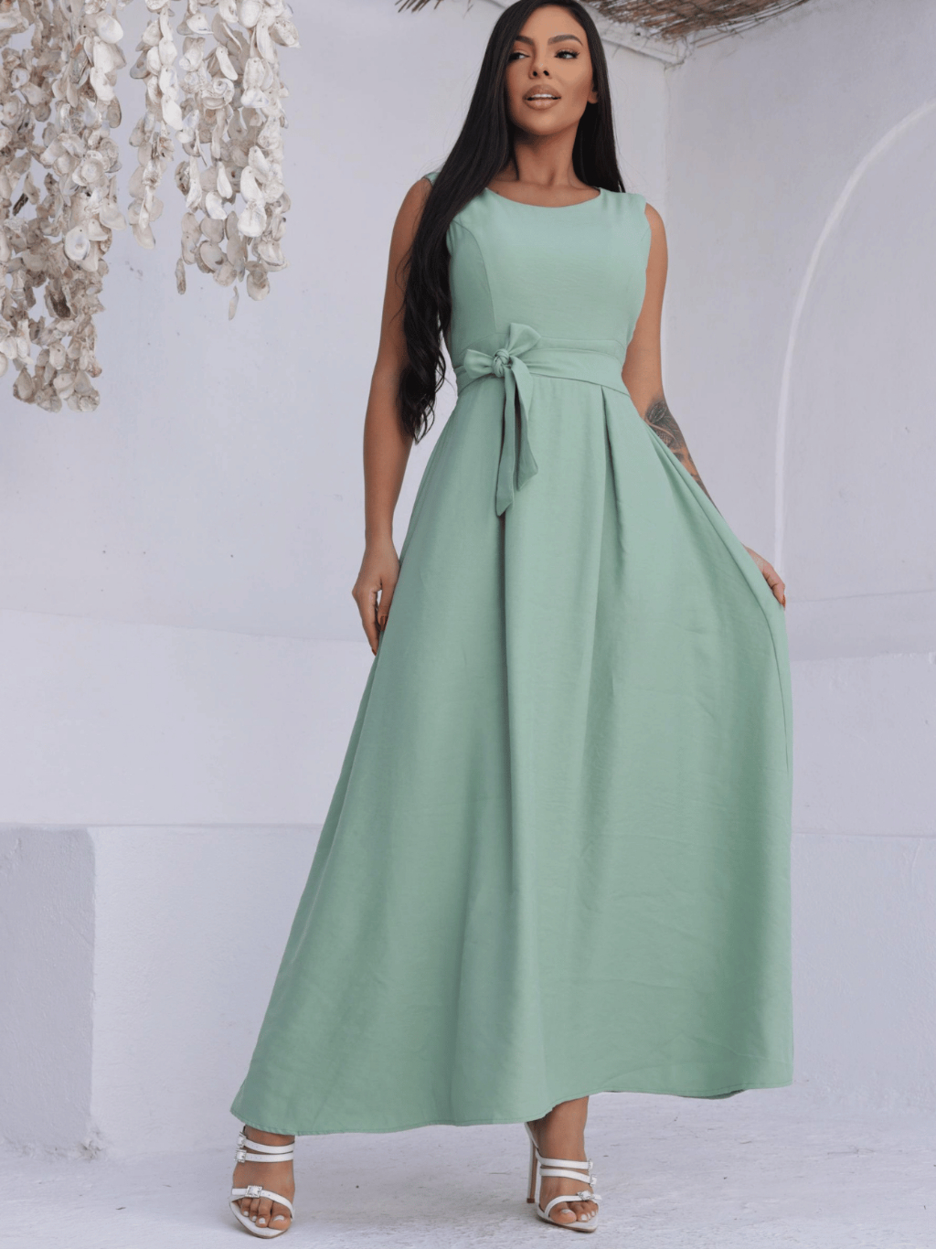 Vestido Feminino Longo Sem Mangas Com Amarração na Frente Rodado Festa Tendencia
