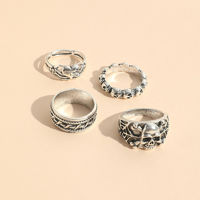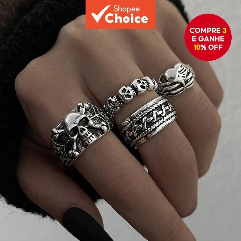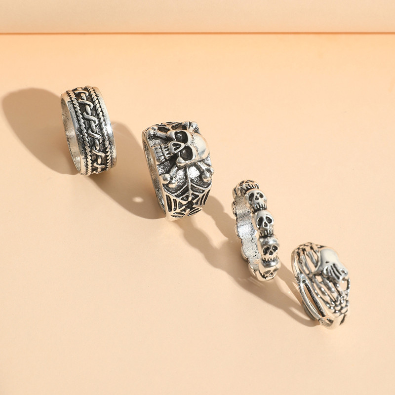 Conjunto De Anel De Coração De Caveira Punk Goblin Prateado De 4 Peças , Acessórios Felpudos Para Uma Declaração De Esti