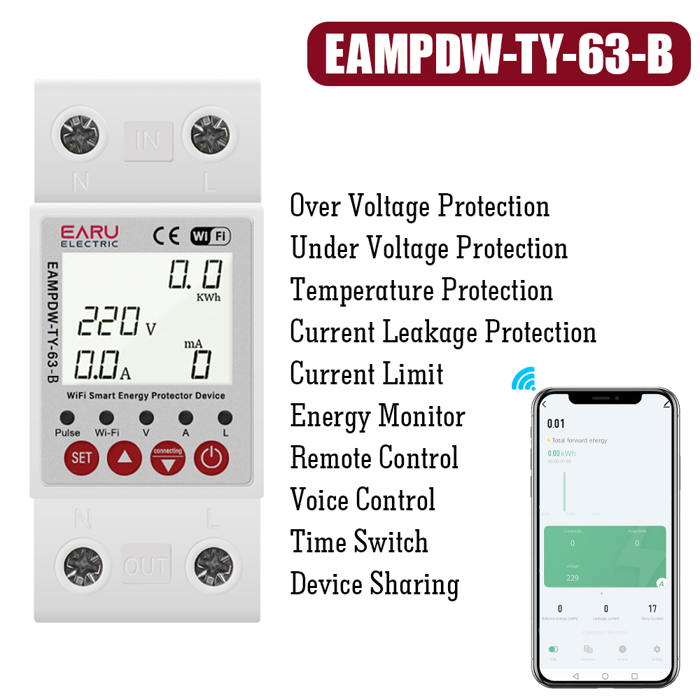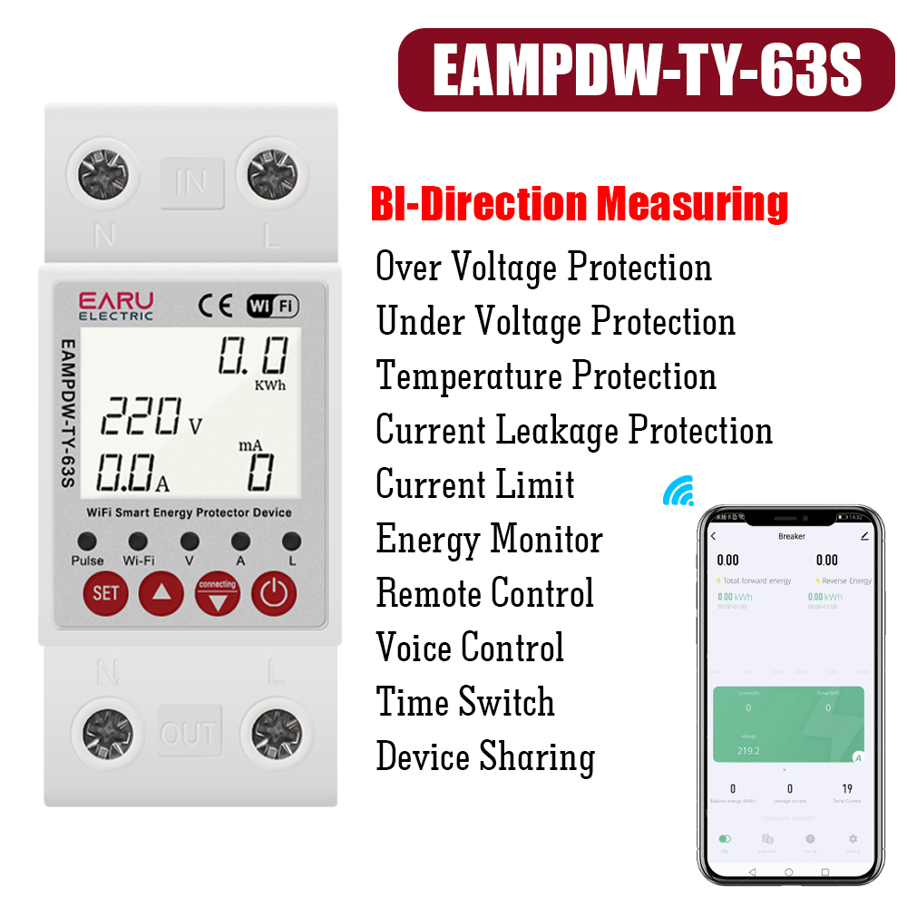 Funciona Com Tuya WiFi Disjuntor Inteligente 2P 63A 230V Medidor De Energia Power kWh Vazamento Sobre Sub Tensão Proteto