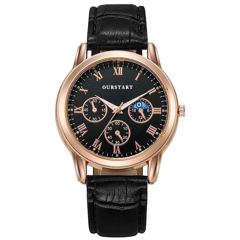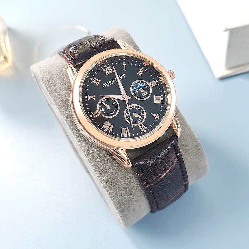 Relógio De Quartzo Masculino Mostrador Preto Fase Da Lua Três Olhos Com Pulseira Marrom De Couro Sintético Casual