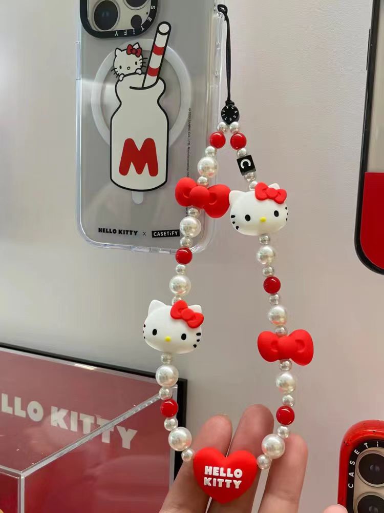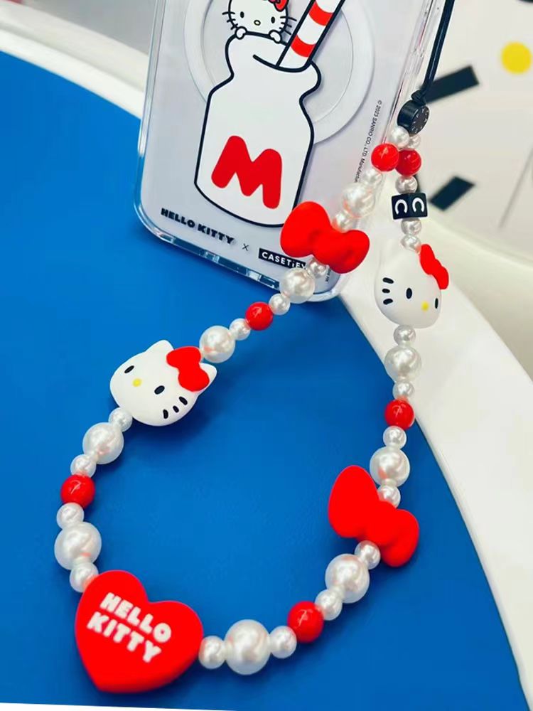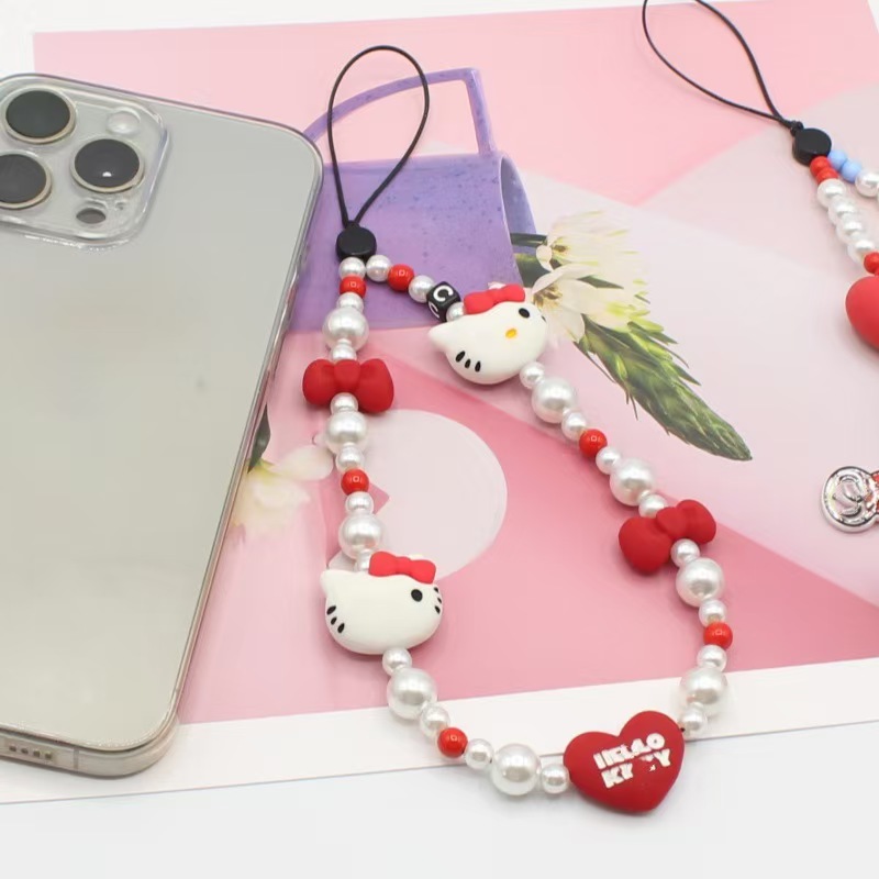 Pingente de Telefone Celular Silicone Gato Contas Pérola Acrílica Anti-Perda Pulseira Chaveiro Fofo para Meninas