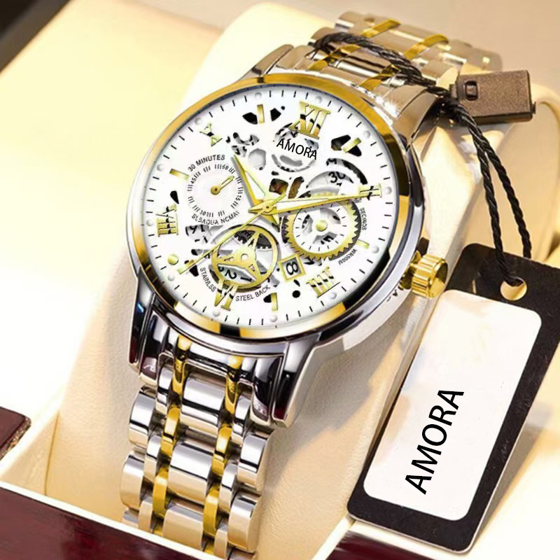Relógio Esqueleto Masculino , Movimento De Quartzo , Calendário Luminoso , Estilo Empresarial , Tom Dourado Preto