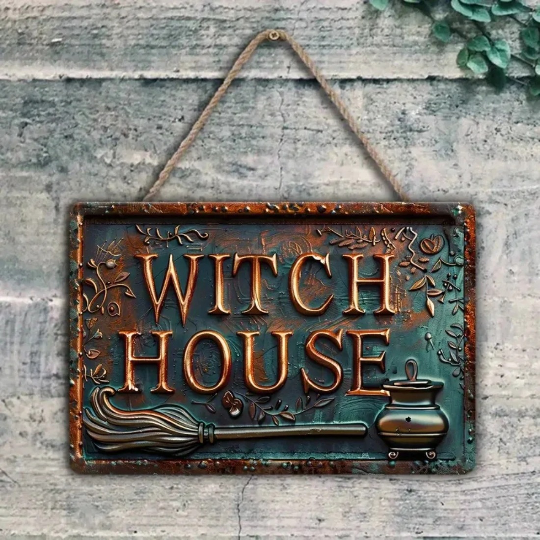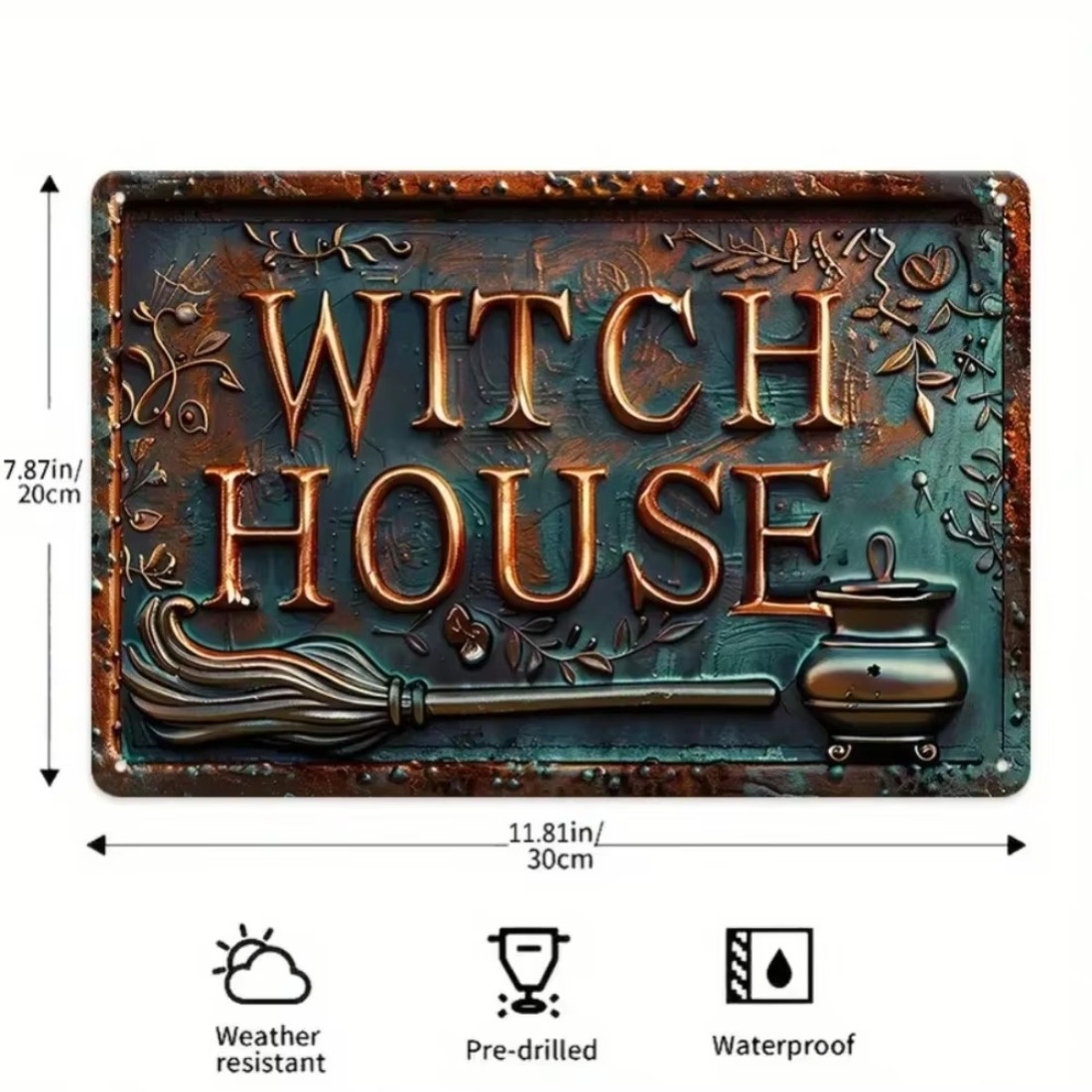 Casa de Bruxa Vintage 2D Rústica Placa Metálica de Parede Decoração de Halloween