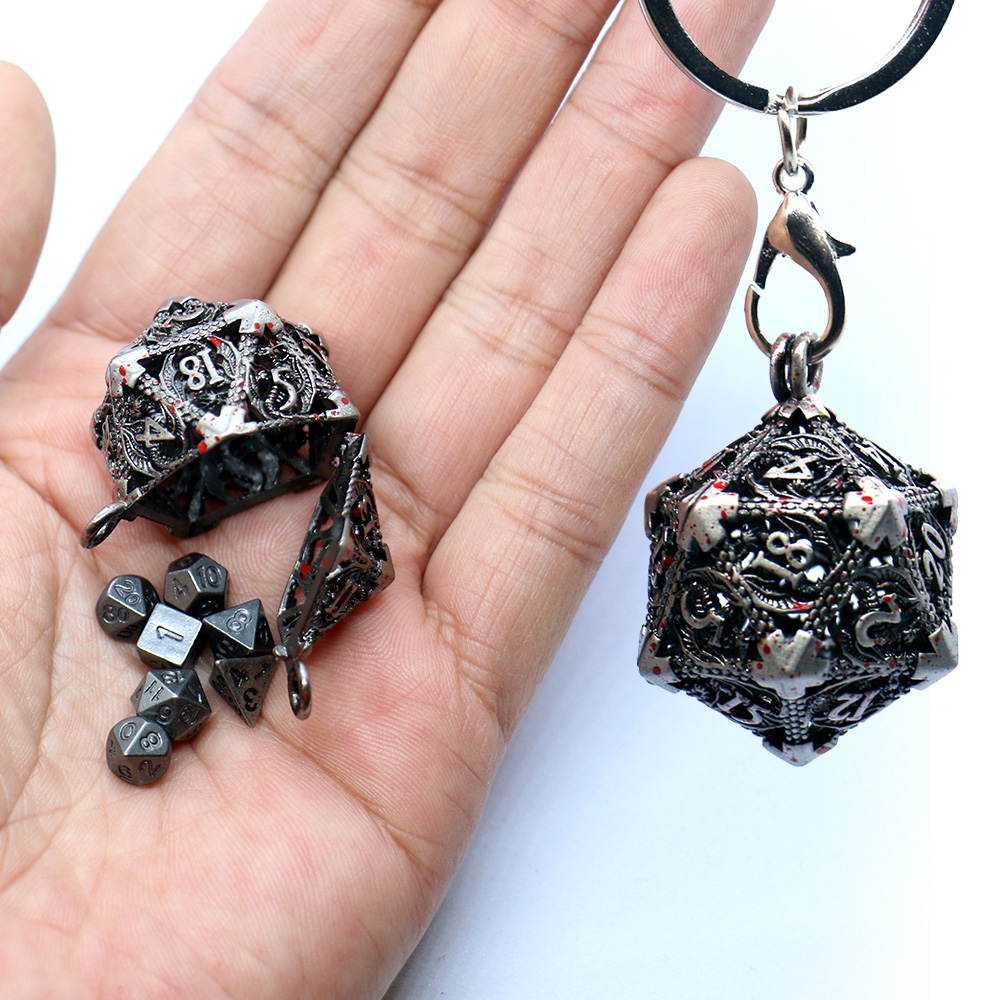 D20 Caixa Oca de Metal + Conjunto de 7 Dados de Metal, Kit Mini Dados de Jogo de Tabuleiro Portátil