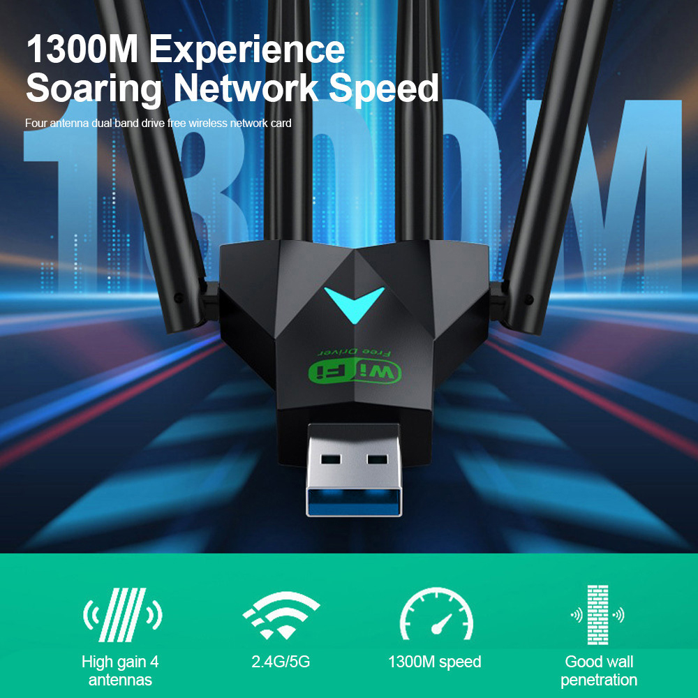 Adaptador USB Wifi 1300Mbps com 4 Antenas, Placa de Rede Sem Fio de Banda Dupla 2.4G 5Ghz para Windows XP, 8, 10, 11
