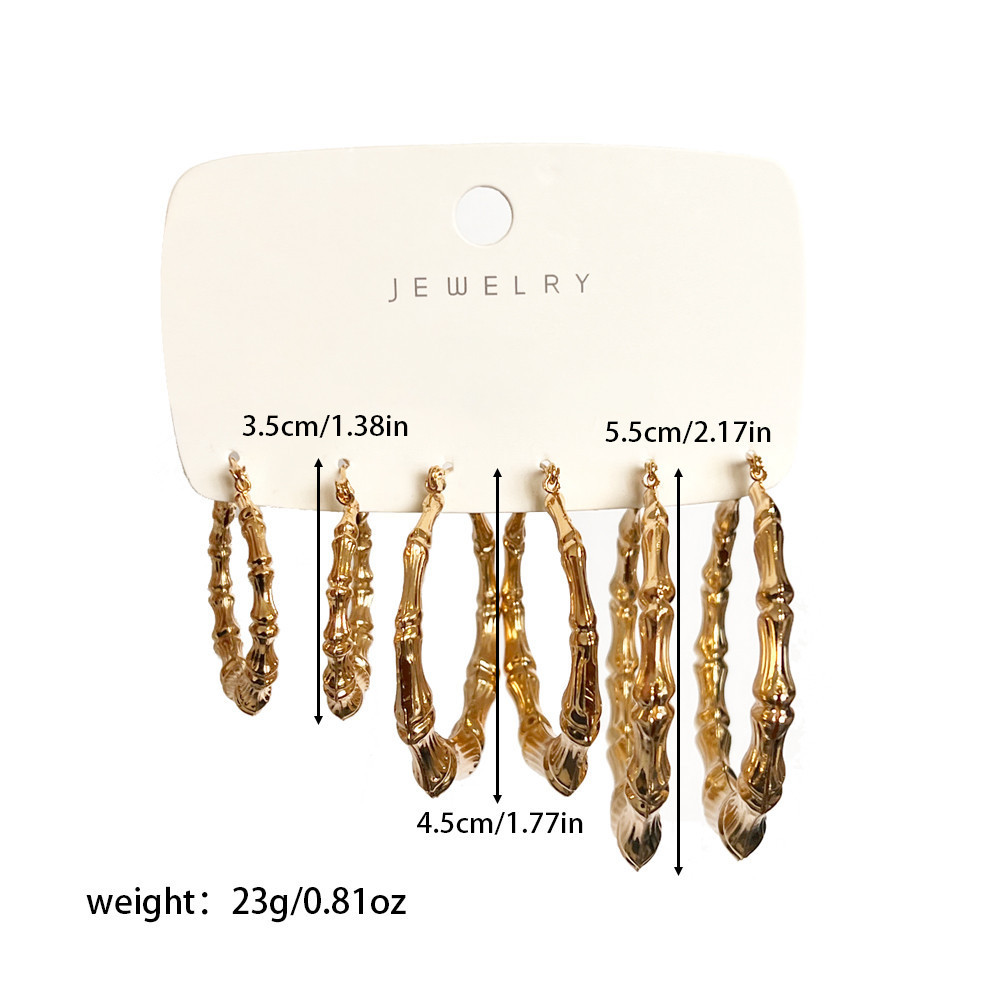 3 Pares de Brincos Argola de Metal Dourado para Mulheres Conjunto de Brincos com Padrão de Junta de Bambu Estilo
