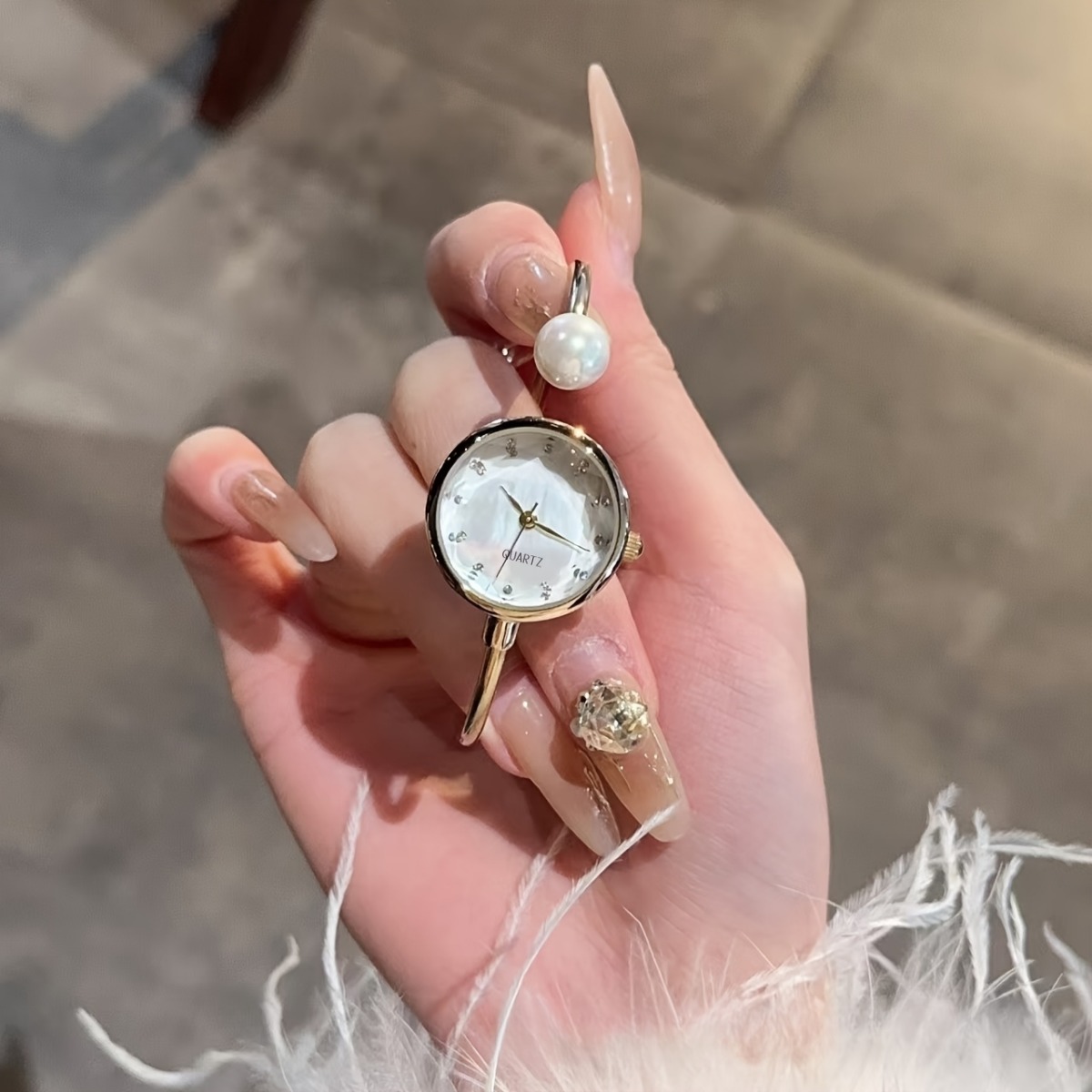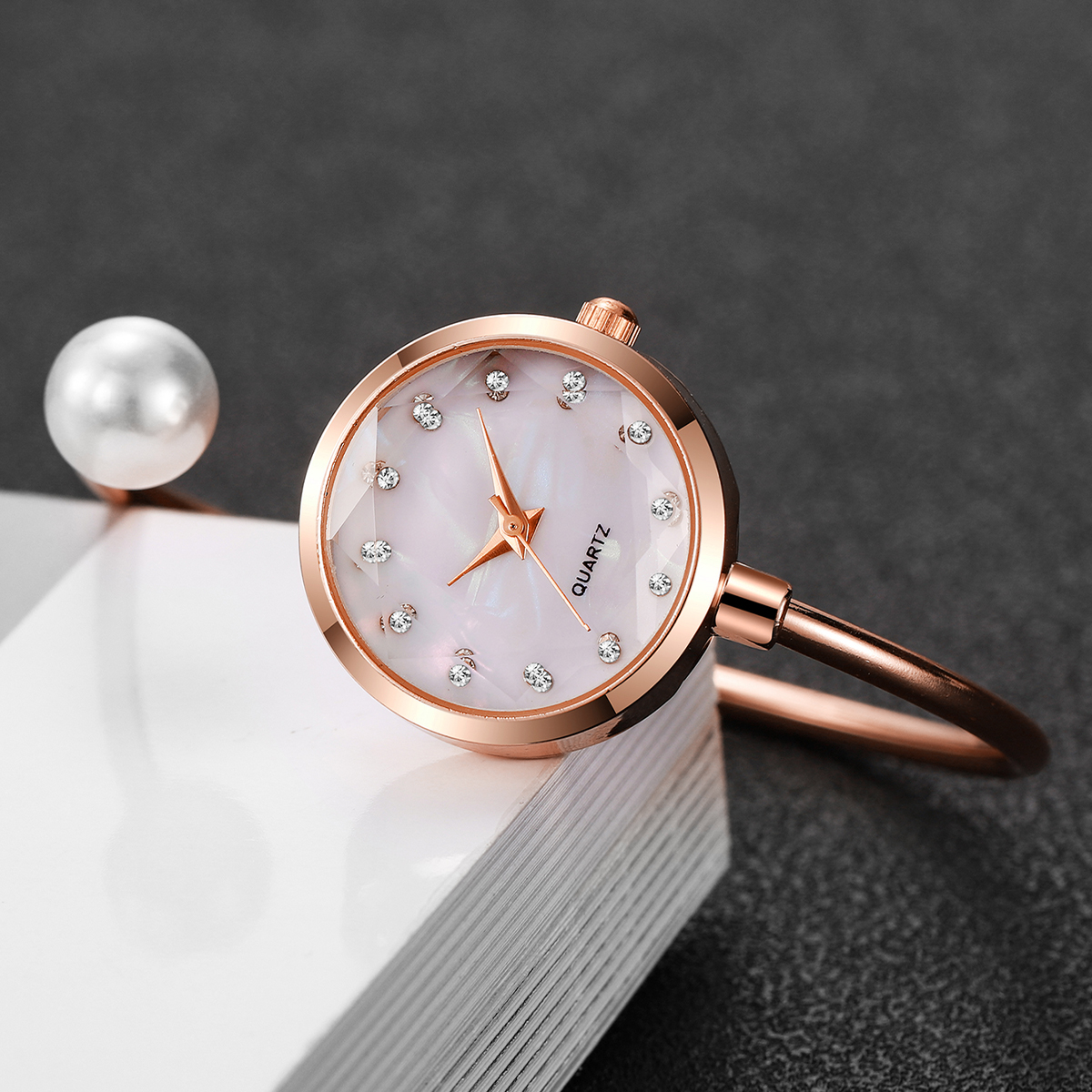 Relógio de pulso elegante com pulseira de pérola e mostrador com diamantes