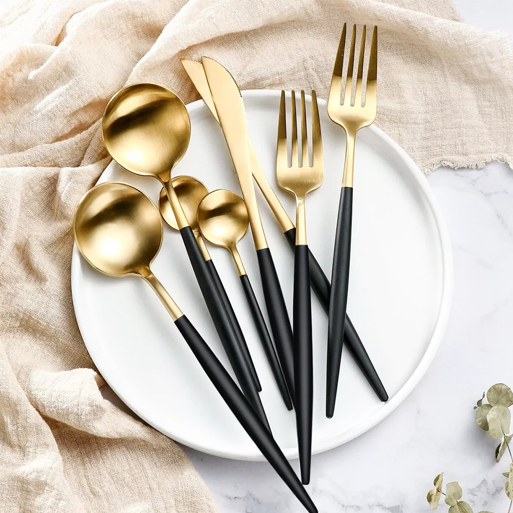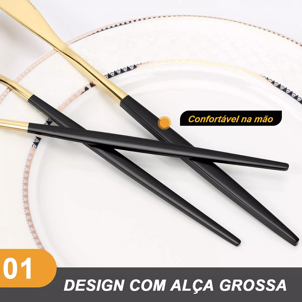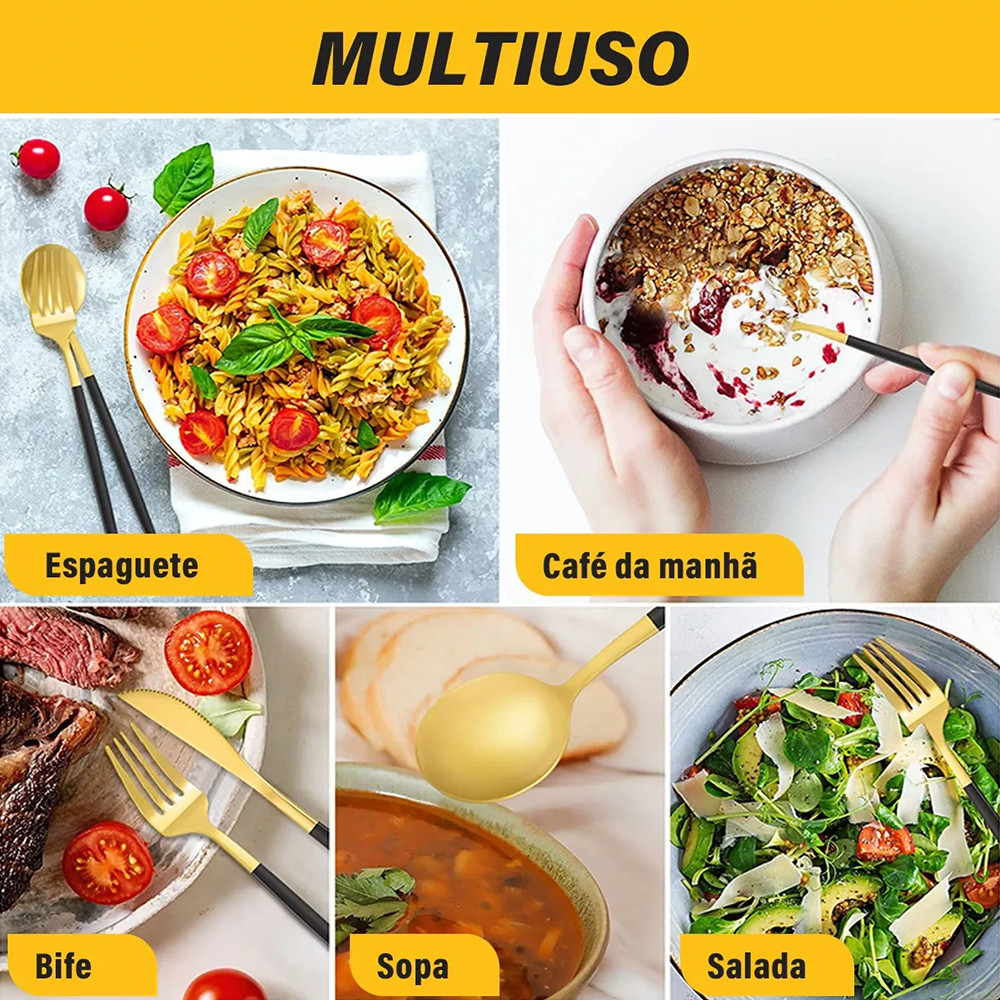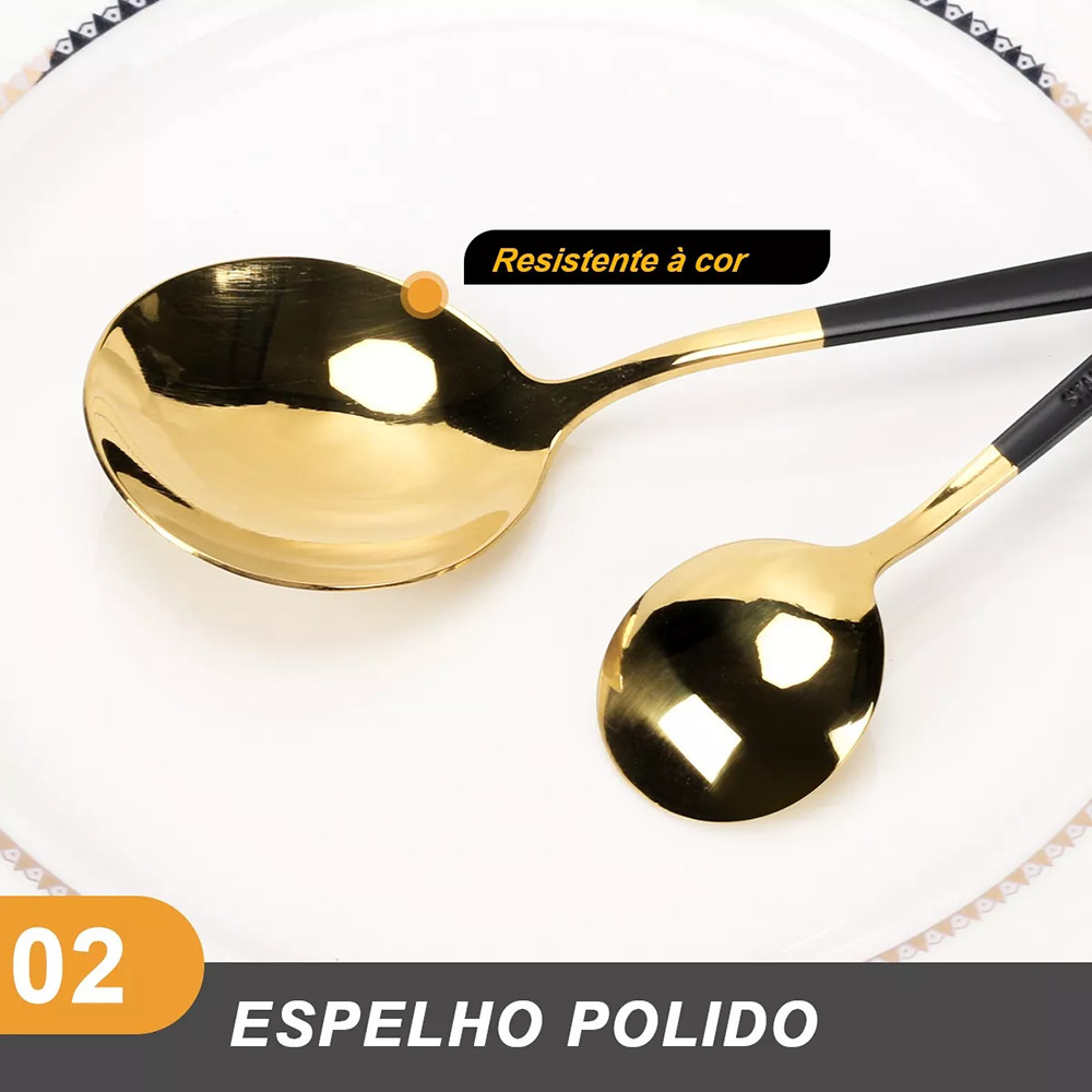 Kit 24 Peças Jogo De Talheres Preto Dourados Aço Inoxidável 416