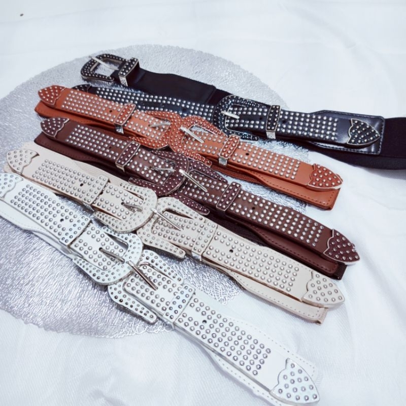 Cinto elástico largo e versátil com fivela dupla e decoração personalizada sem rebites