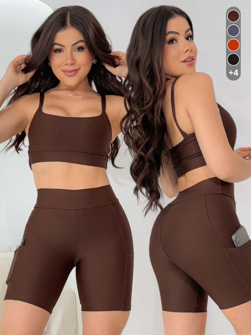 Conjunto Fitness Feminino Top + Short Com Bolso Suplex Academia Treino Corrida Caminhada