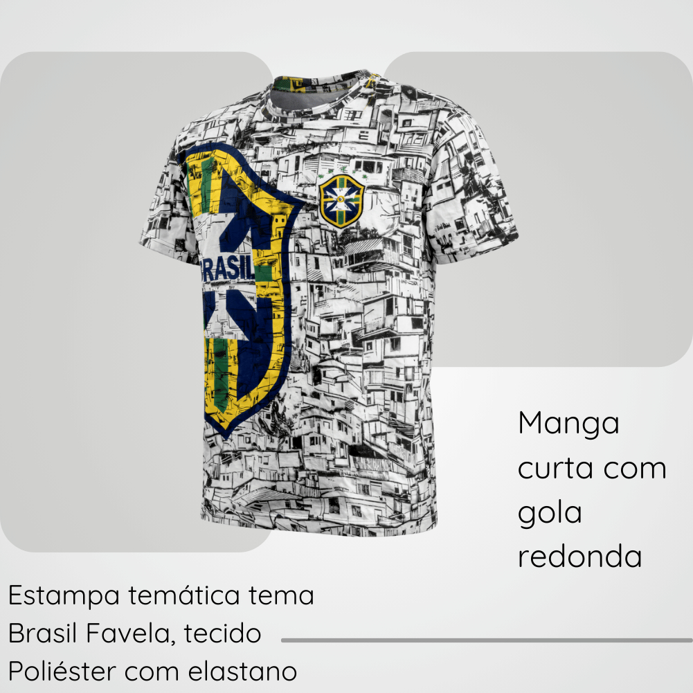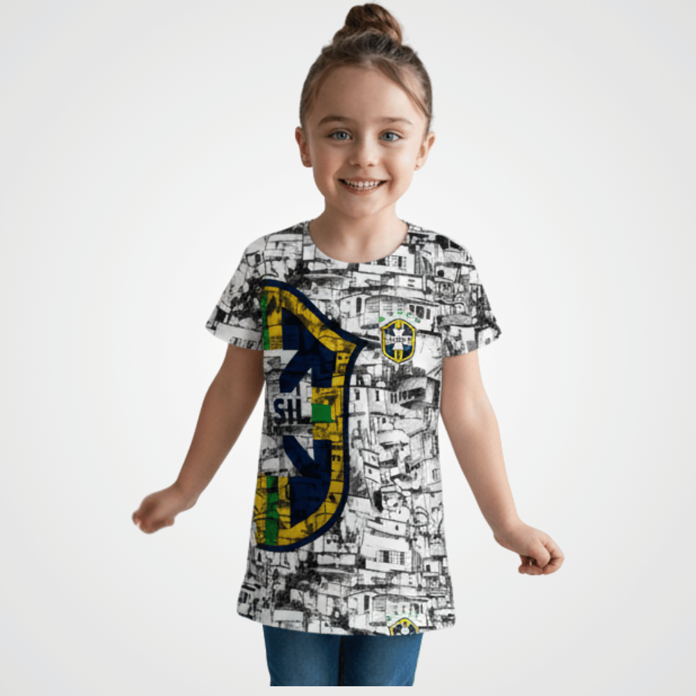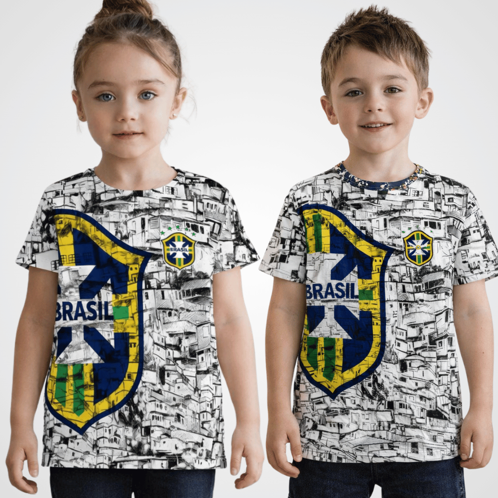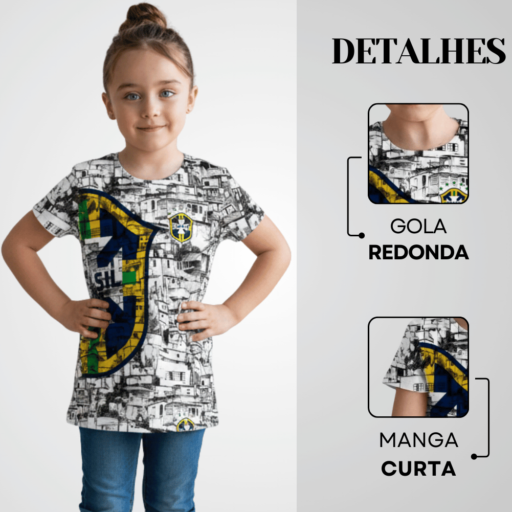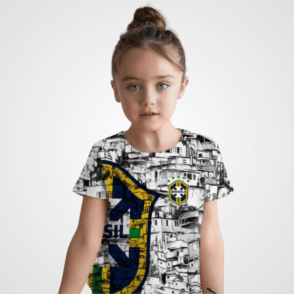 Camiseta Infantil Unissex Premium Brasil Favela Poliéster Estampada Copa Manga Curta Confortável